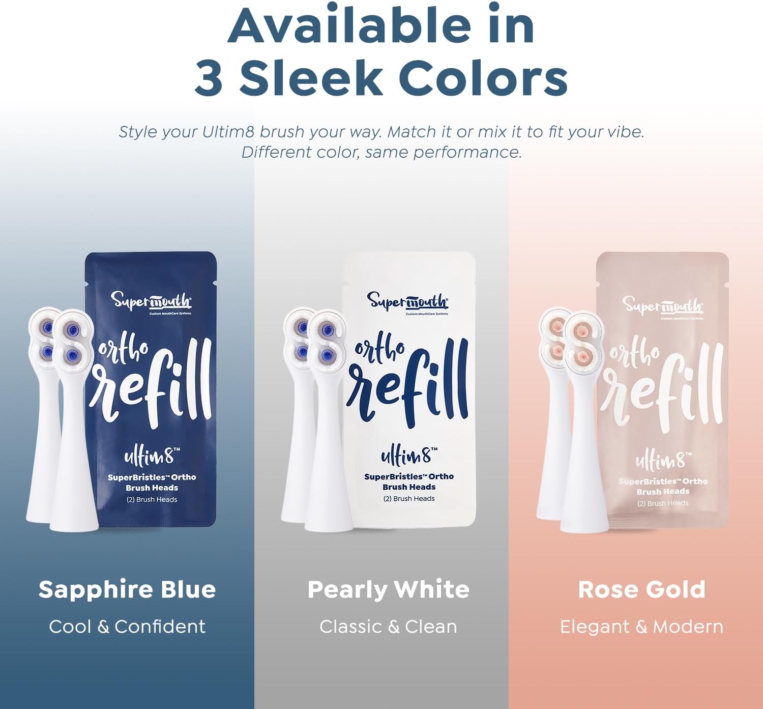 SuperMouth® SuperBristles® Ortho Replacement Brush Heads for Ultim8 SmartBrush – Ultra-Soft Bristles Clean 60X Better Around Braces, Advanced Sonic Cleaning, Dual Modes, 3 Color Options
