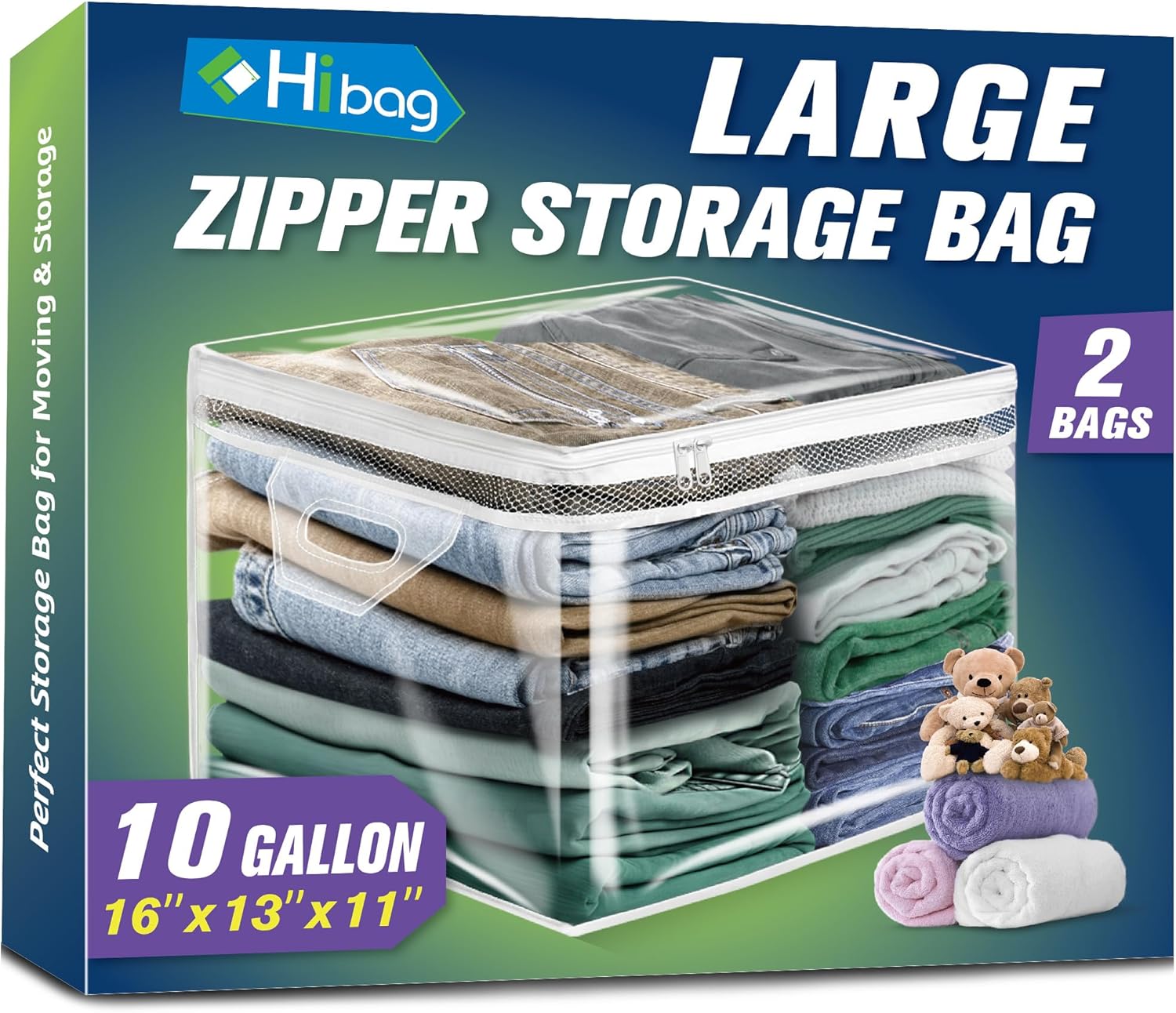 HIBAG 10 Gallon Large Storage Bag for Clothes, Zipper Clothing Storage Bag, Clear Organizer with Reinforced Handles, for Closet and Underbed Storage (2 Pack)