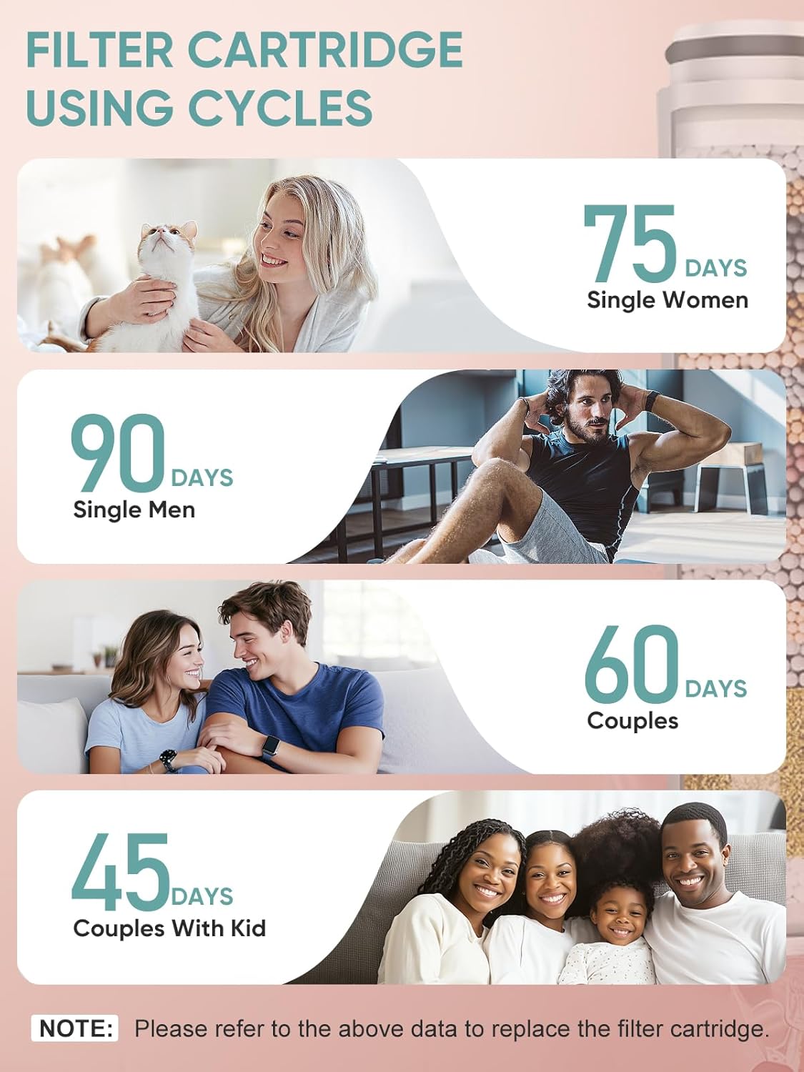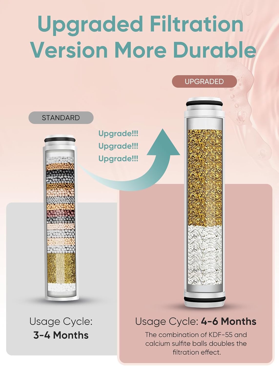 - Standard: Features a 20-layer filtration system that effectively removes chlorine and heavy metals from water. Recommended replacement cycle: 3-4 months (the specific lifespan depends on the water quality in your area).