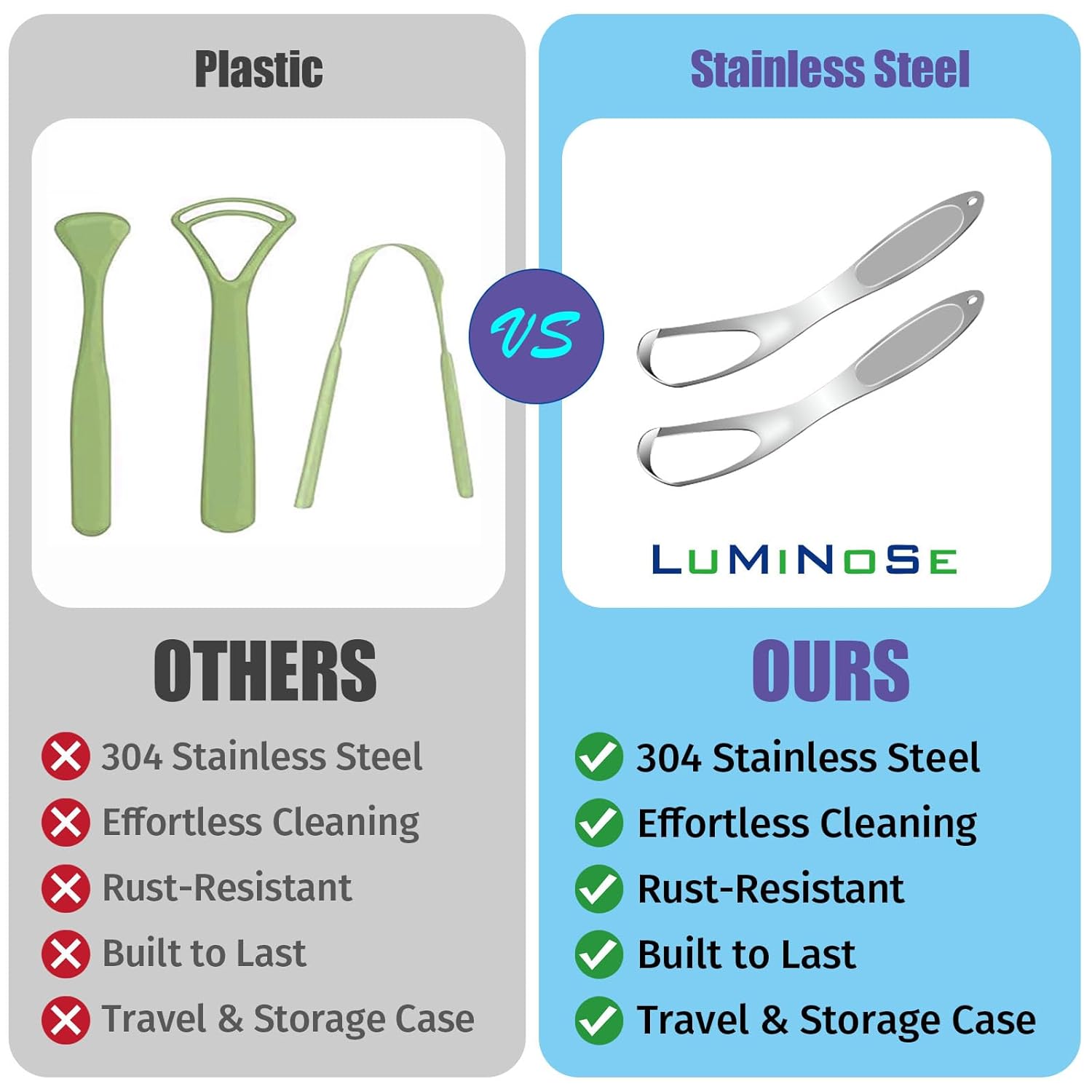 • REDUCE BAD BREATH: Remove food particles, and toxins from your tongue in seconds with our stainless steel tongue scraper. Regular use helps reduce bad breath, enhances taste, and boosts overall oral hygiene, leaving your mouth feeling fresher and your dental health improved after every use.