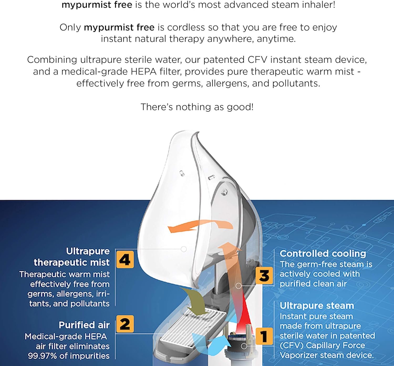 - ๐๐ผ๐ฟ๐ฑ๐น๐ฒ๐๐ ๐ฃ๐ผ๐๐ฒ๐ฟ๐ณ๐๐น ๐ฅ๐ฒ๐น๐ถ๐ฒ๐ณ: Mypurmist Free offers the worldโs only fully cordless, battery-operated steam inhaler. Steam therapy is recommended by doctors and other healthcare experts for upper respiratory relief. Mypurmist Free delivers 100% ultrapure, drug-free steam using patented micromist technology to provide powerful humidity, effectively alleviating sinus congestion, colds, and allergies in an instant.