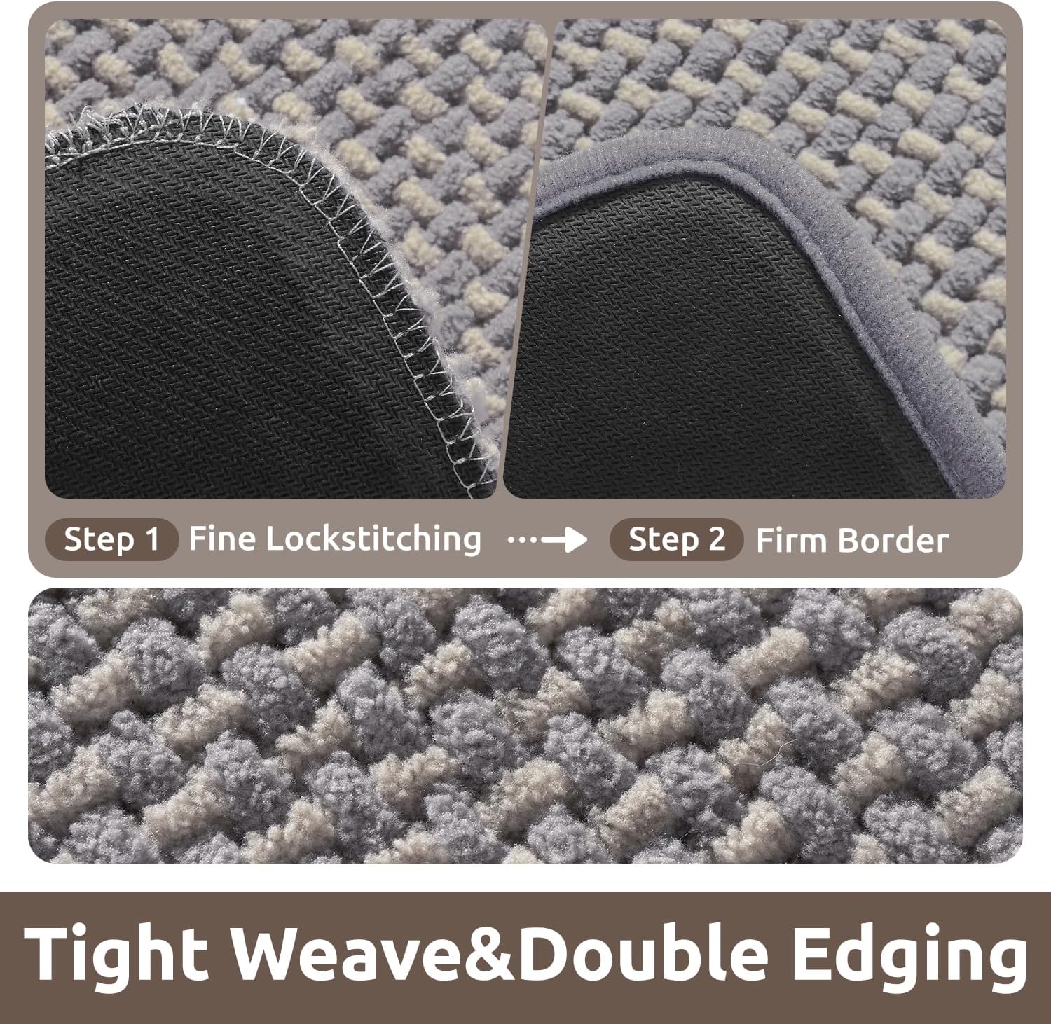 - [Update Double Edge & Color] Tightly woven bathroom rugs with double locking edge process makes bath mats more stable, not easily dispersed, more robust than most of others chenile bathroom mats. Stylish two-color design versatile, chenille bath rugs make your feet feel relaxed. Integrated design of surface and backing prevents shedding and deformation.
