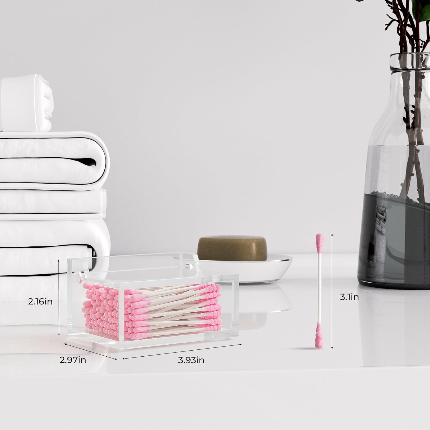 Clear Acrylic Qtip Holder with Lid, Cotton Balls Swab Organizer, 3.9" x 2.8" x 2" Dispenser for Makeup Pad, Floss Picks, Bath Salts, Cosmetic Storage Case, Home Bathroom Decor (DP051)