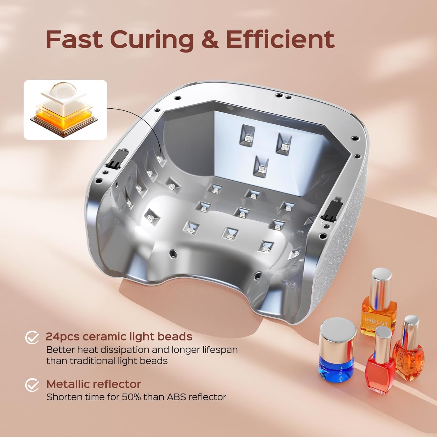 - [Fasting Curing All Gel] BOLASEN new LED beads technology combine to metal base and metallic reflector, your average curing time is shortened by 70% with P30 Pro. 24pcs LED beads evenly-distributed for full coverage. The UV lamp beads design single chip and wavelength, increasing the power of light, faster to cure all gel polish, base/top coat, builder gels, etc.