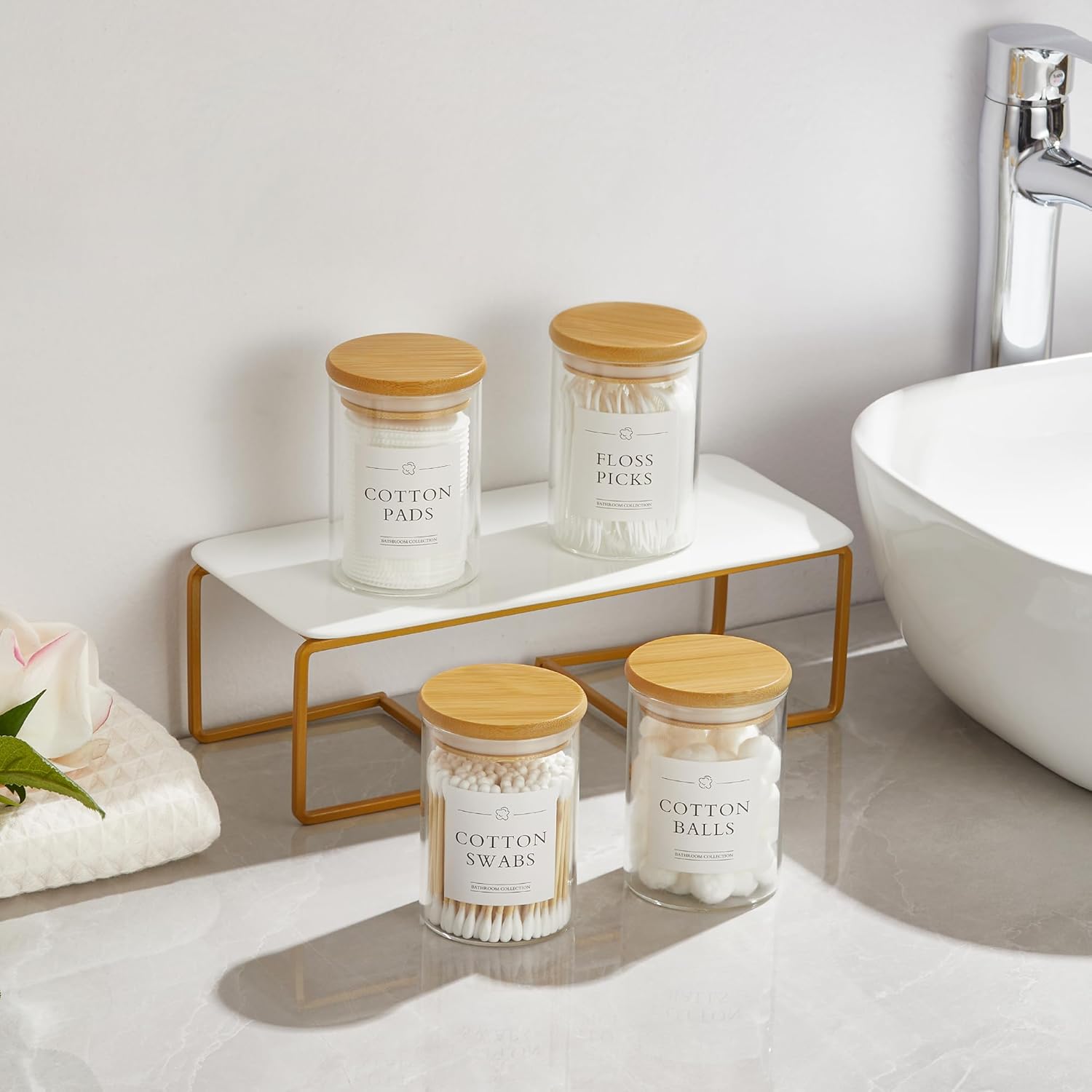 - Qtip Holder Bathroom Set: The q tip holder set includes 4 pack glass bathroom containers jars; 6 labels with black pre-printed words (Cotton Swabs, Cotton Balls, Cotton Pads, Floss Picks, Hair Ties, Bath Salts); and 3 blank labels.