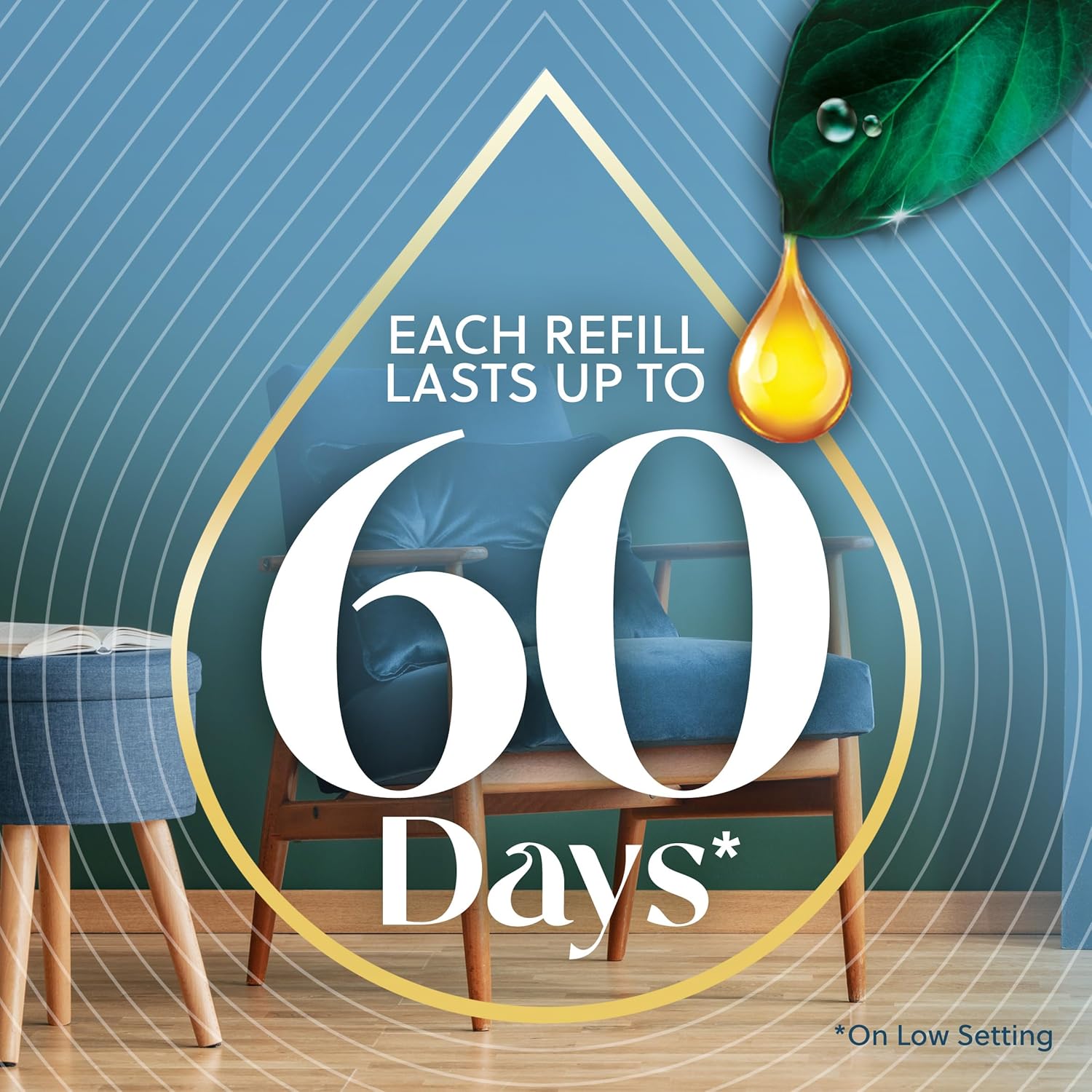 - Enhance your home’s scent with Air Wick Scented Oil Refills with continuous fragrance for up to 60 days (based on low setting). Our air freshener plug in refills are infused with 100% natural essential oils. Our latest Air Wick scented oil warmer optimizes airflow for 360-degree fragrance diffusion, reaching every corner of the room for a consistent fragrance experience. The Air Wick Scented Oil warmer allows you to choose between 5 fragrance settings for just the right amount of fragrance. It continuously diffuses and carefully blends fragrance throughout your home, office, or any space.