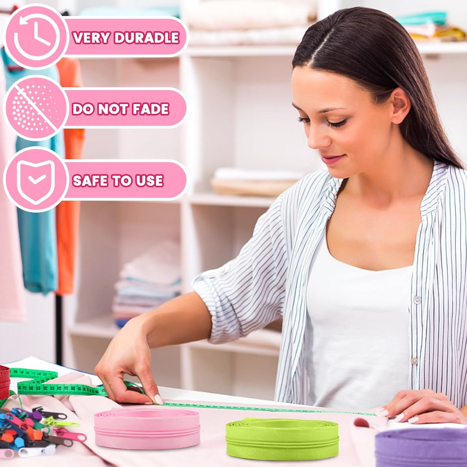 - Multi-function: long enough, multi-purpose use, can be used in Western skirts, dresses, can also be used in cushions, bag zipper, pet clothes, hand bags, cushion, pillowcase, handicraft, luggage, can also be decorated as colourful ornaments DIY products.