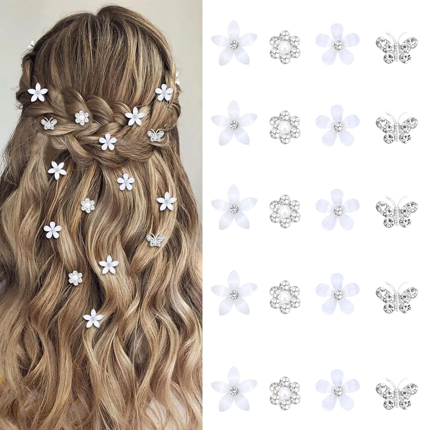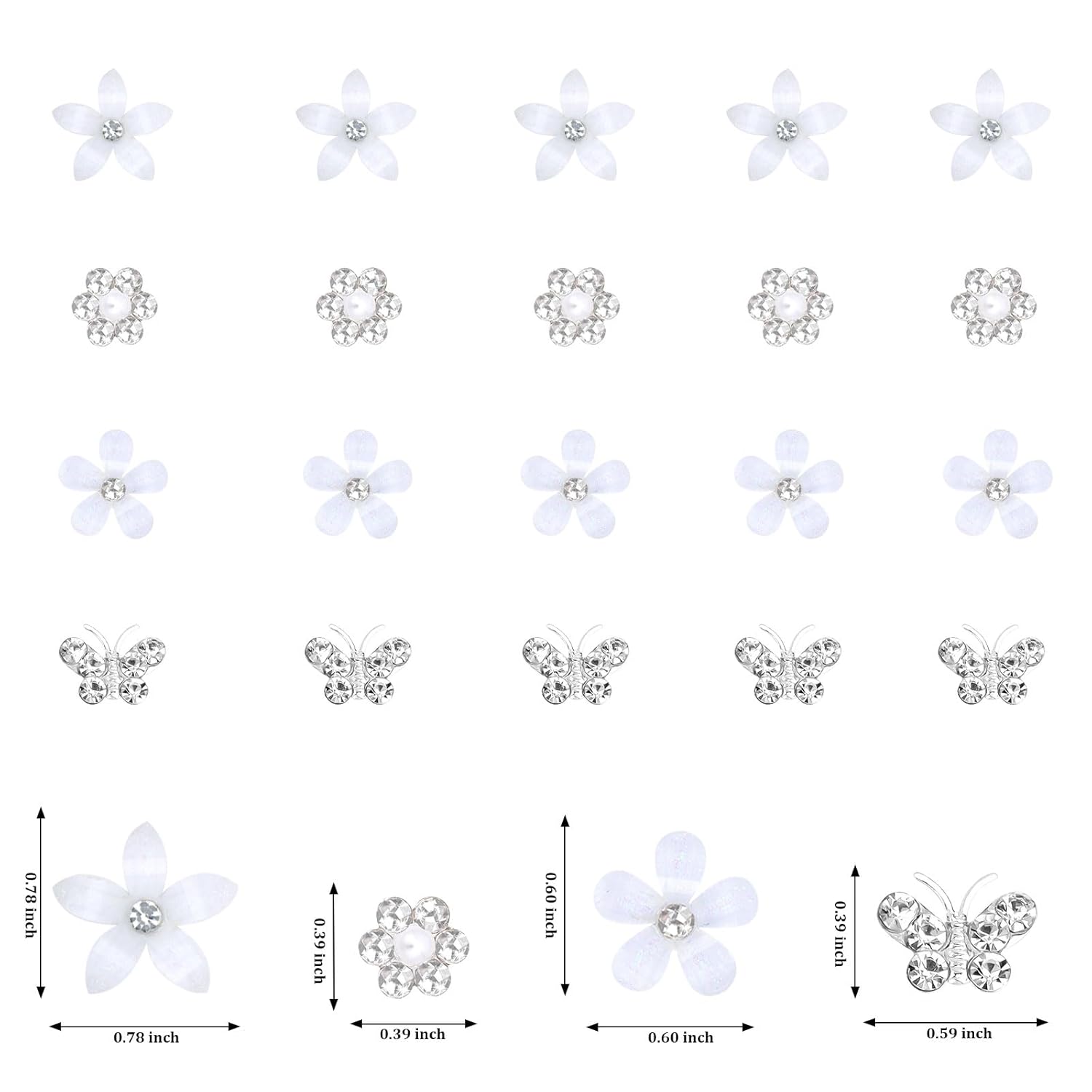 YISSION 20 Pcs Mini Flower Hair Clips Rhinestone Butterfly Hair Pins Small Decorative Hair Clips Wedding Hair Barrettes White Hair Clips Bridal Flower Girl Hair Accessories for Girls Women