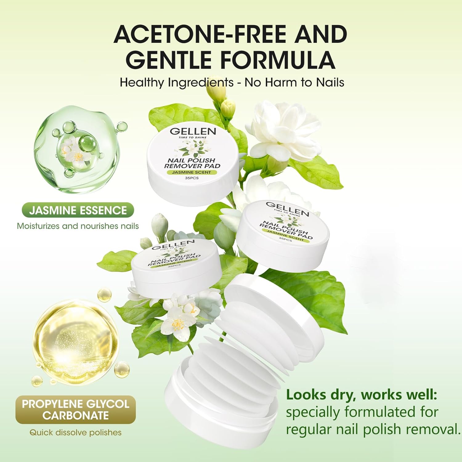 Gellen Nail Polish Remover Pads Non-Acetone Traditional Nail Polish Remover Wipes, 140pcs Travel Wets Bulk Set For Clearing Regular Manicure Salon Home, Jasmine Scent