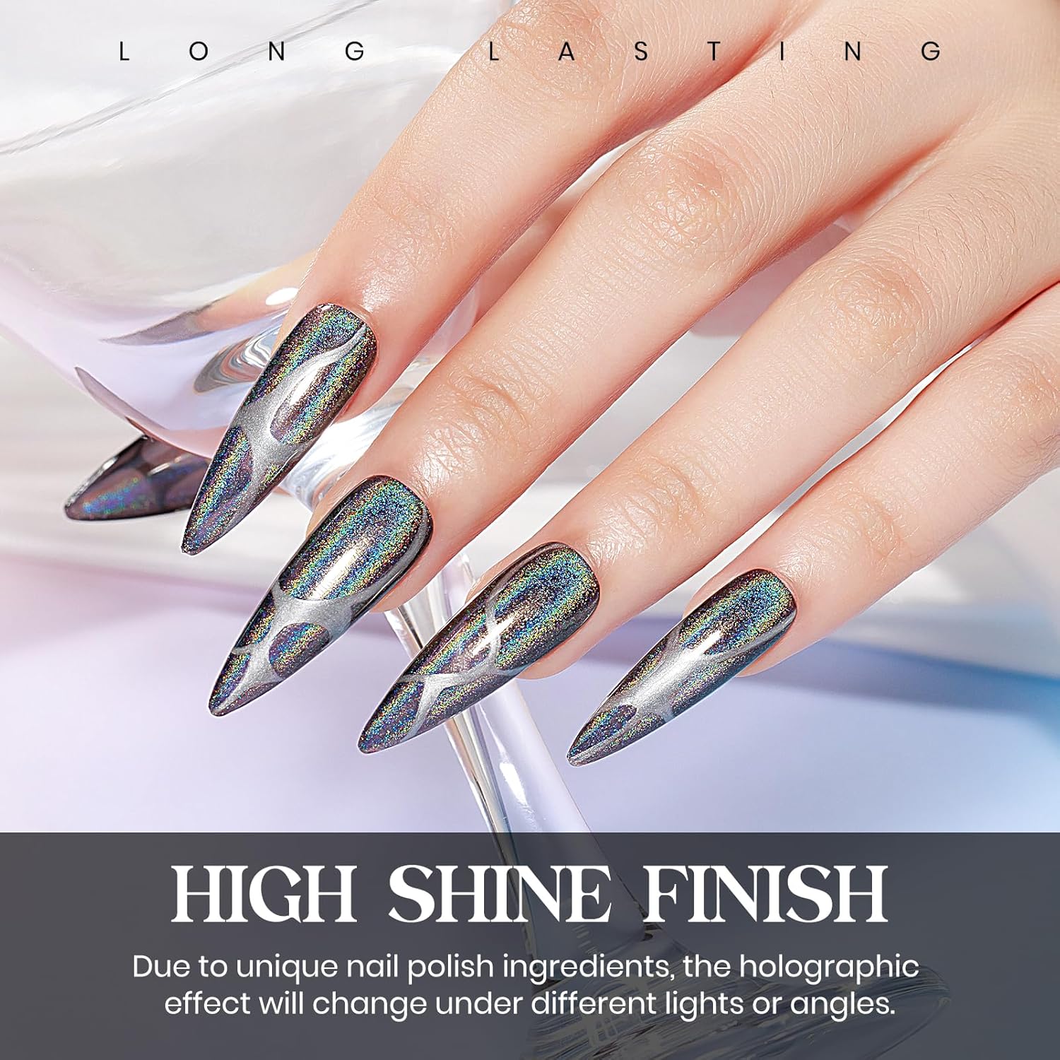 - Healthy Manicure: Made from natural ingredients, low odor, non-toxic. No harsh formula that lead to damaged nails. We choose high proportion holographic laser particles to make effect more obvious, and also provide high coverage on nails.