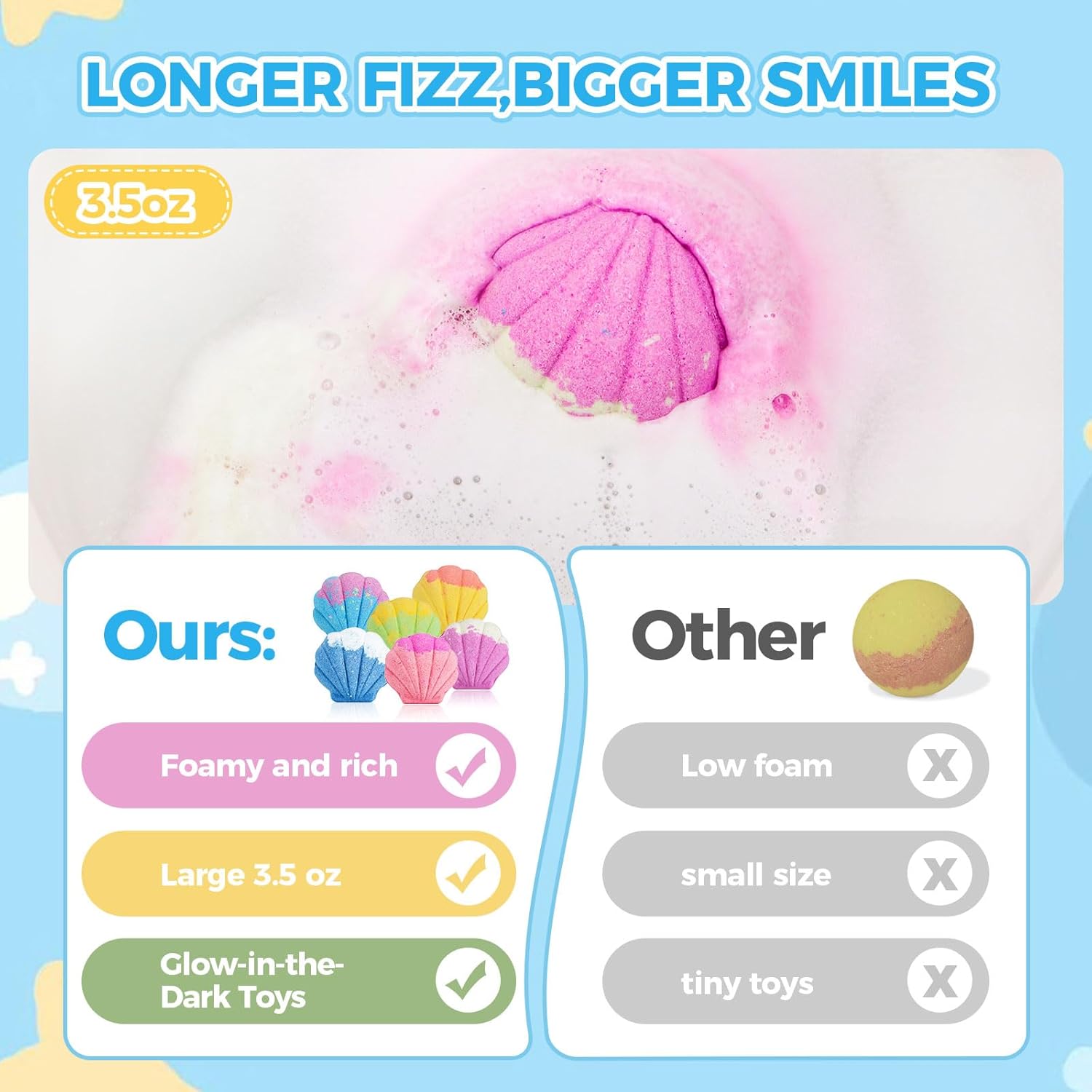 - Magical Mermaid-Themed Bath: Turn bath time into a mermaid adventure! Each bath bombs for kids with surprise inside comes in a charming seashell shape, releasing vibrant colors as it fizzes. Inside, discover 6 glowing mermaid and ocean animal toys for an exciting surprise!