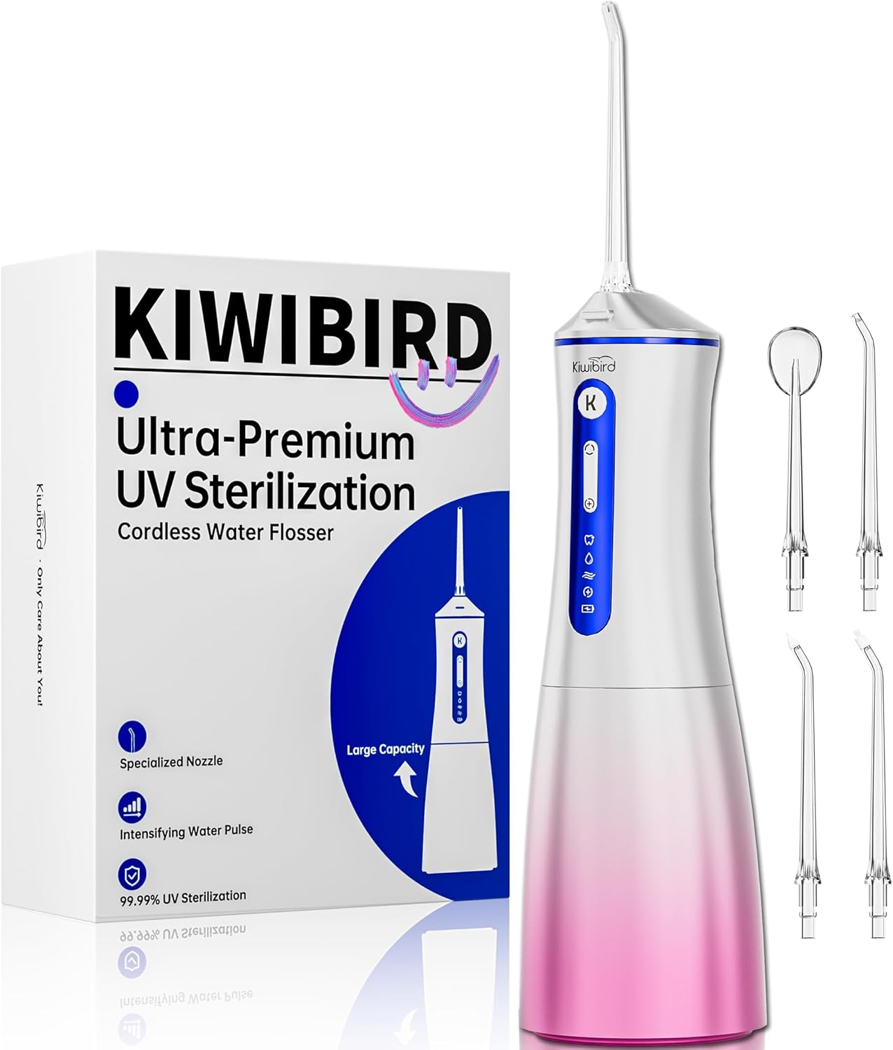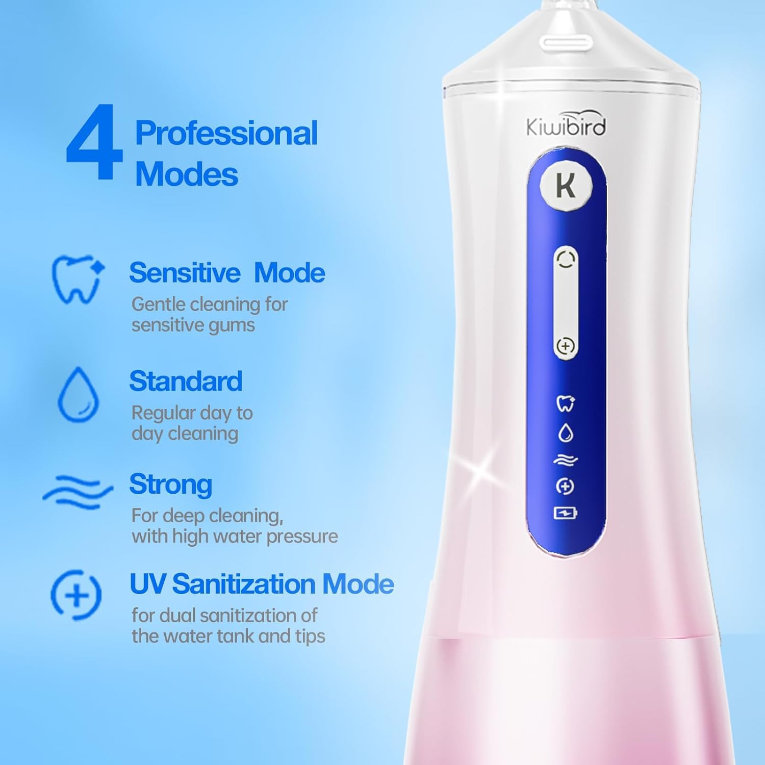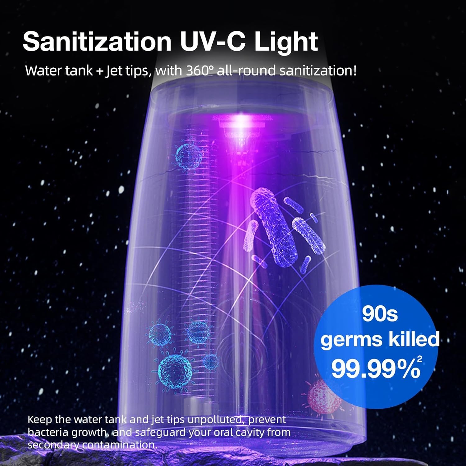 - Advanced 360° UV-C Sanitization for Enhanced Hygiene This water flosser features UV-C sanitization technology that enhances the cleanliness of its components, including the tank, pipes, and nozzles. A smart 90-second timer ensures effective operation, making it a standout in oral care.