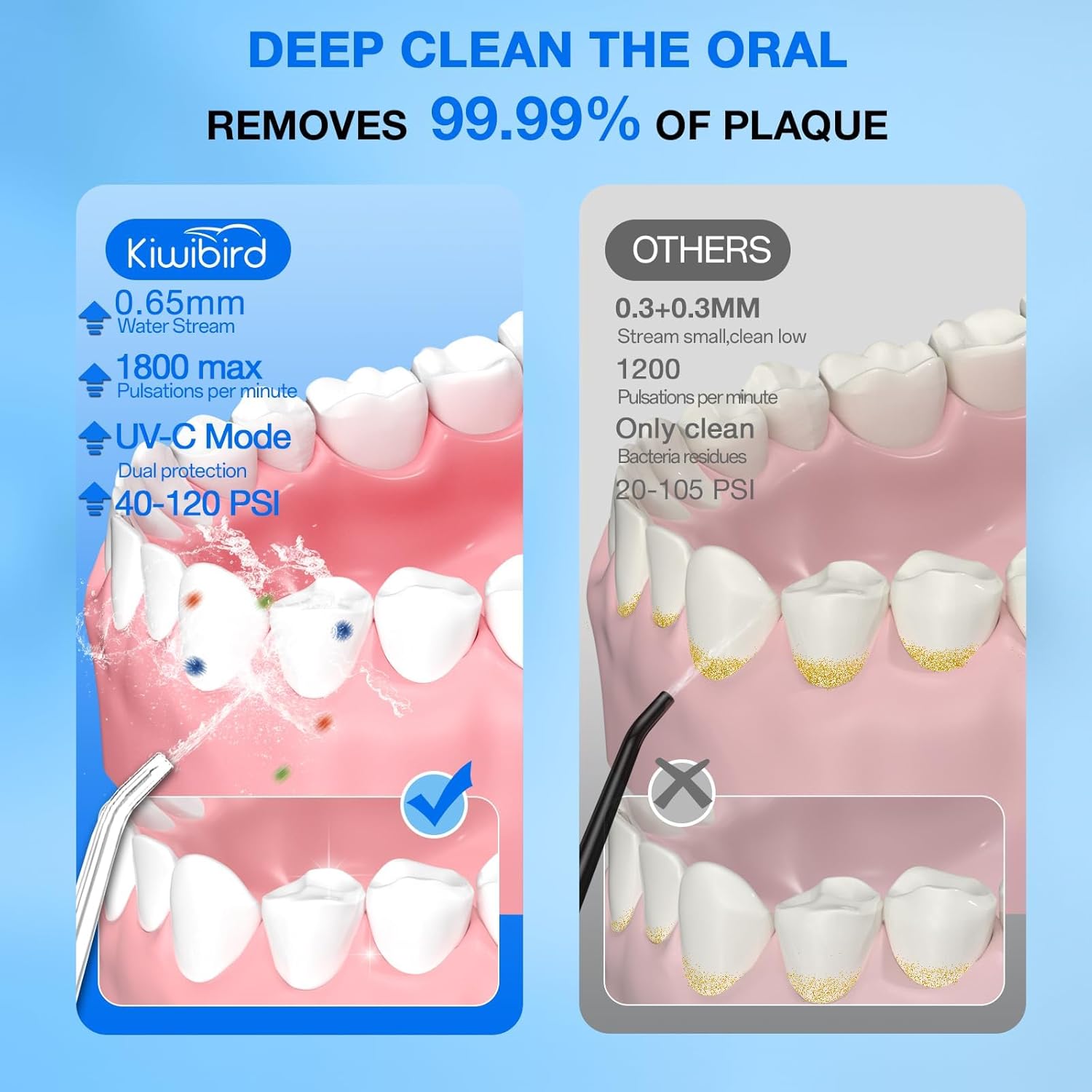- Deep Cleaning for Plaque Removal and Fresher Breath Delivering 1800 ultra-fine water pulses per minute with a pressure range of 40-120 PSI, this flosser ensures effective plaque removal, reduces debris, and supports healthier gums. The ultrasonic micro-bubbles also help freshen breath while providing a gentle gum massage.
