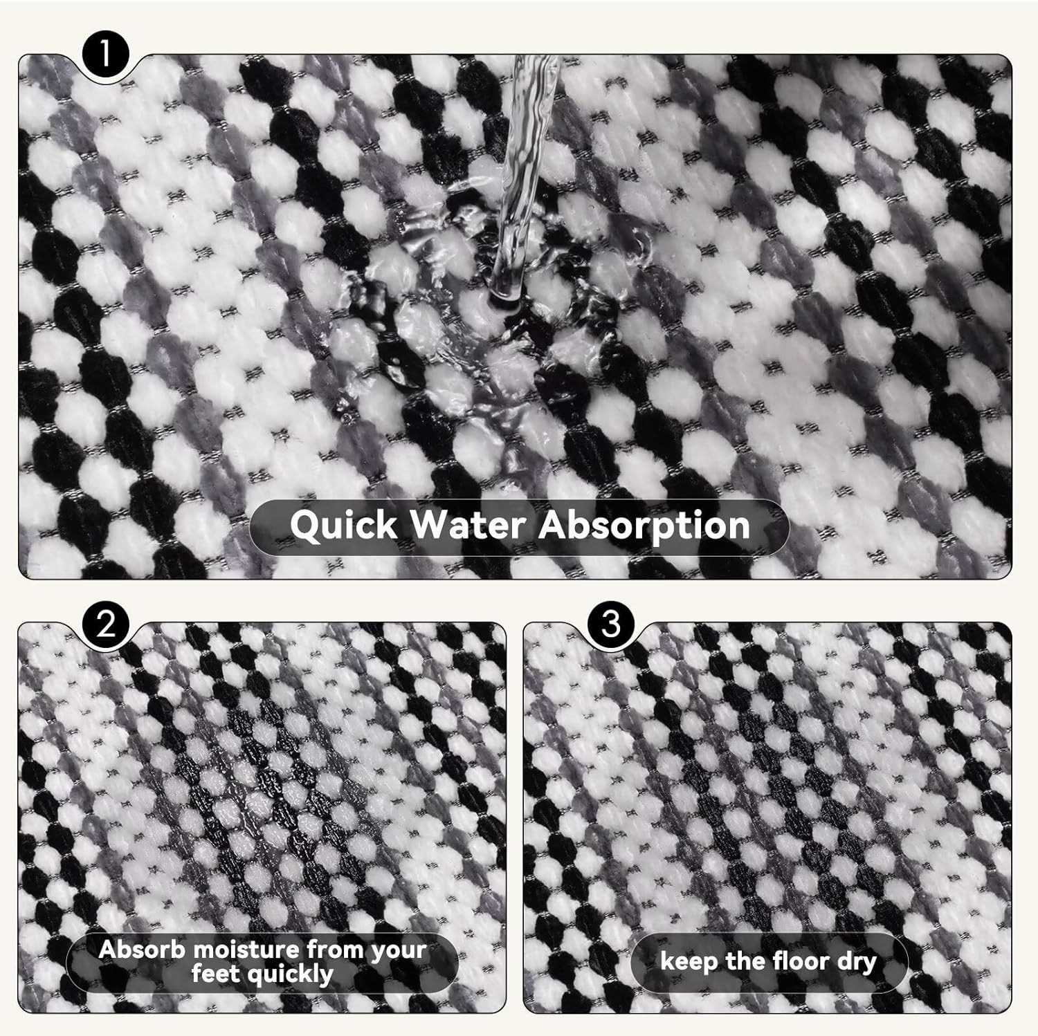 - SUPER ABSORBENT QUICK DRYING BATHROOM RUG - The bathroom rug is made from chenille.This material can immediately dry your feet when you step on them, keep the water to stay on and in the mat and not spill over onto the floor,and prevent the floor from getting wet.