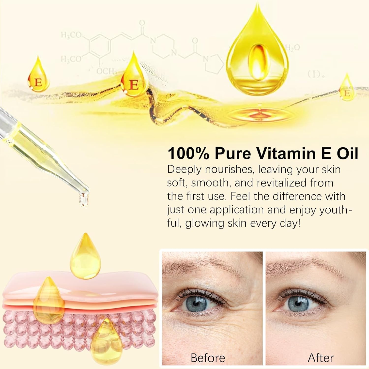 - Pure Natural Body Oil: This vitamin E oil is 100% pure, Not contain chemicals and additives, It is safe to use. You can use it for your body, feet, face, hands, hair and nails