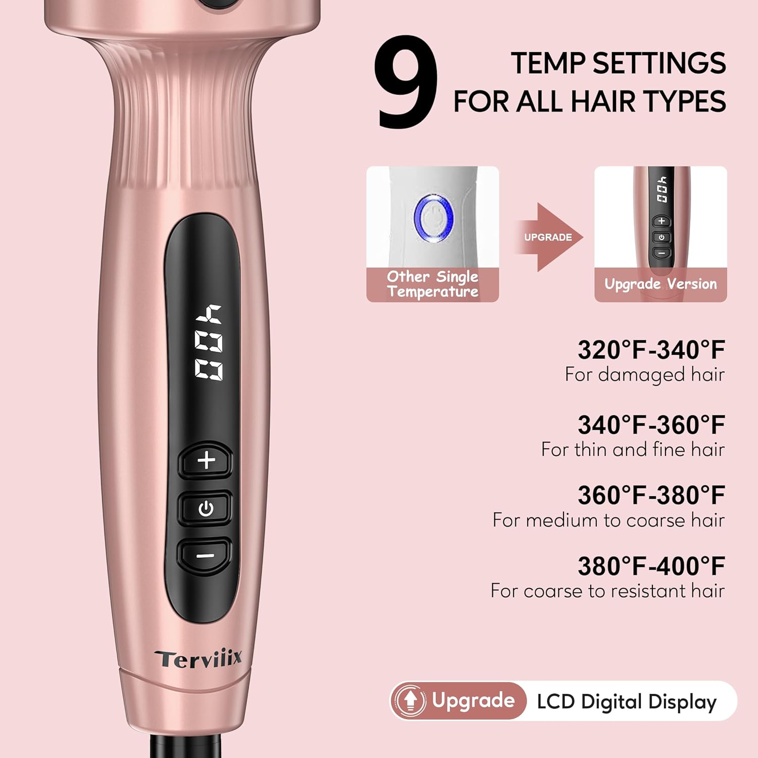 - Customizable Settings: The LCD digital display offers multiple temperature settings from 320℉ up to 400℉, catering to all hair types' styling needs. It also features a 60-minute auto-off for safety, a 360° swivel cord for easy use, and 100-240V dual voltage for travel convenience.