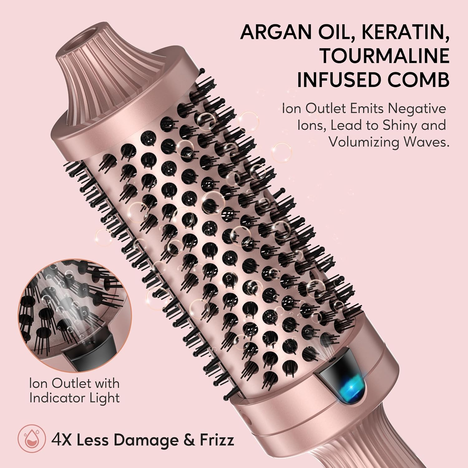 - Less Damage & Frizz: Infused with argan oil, keratin, and tourmaline, this brush emits negative ions to reduce heat damage and frizz, while providing even heat distribution and locking in moisture for silky smooth and healthy hair.