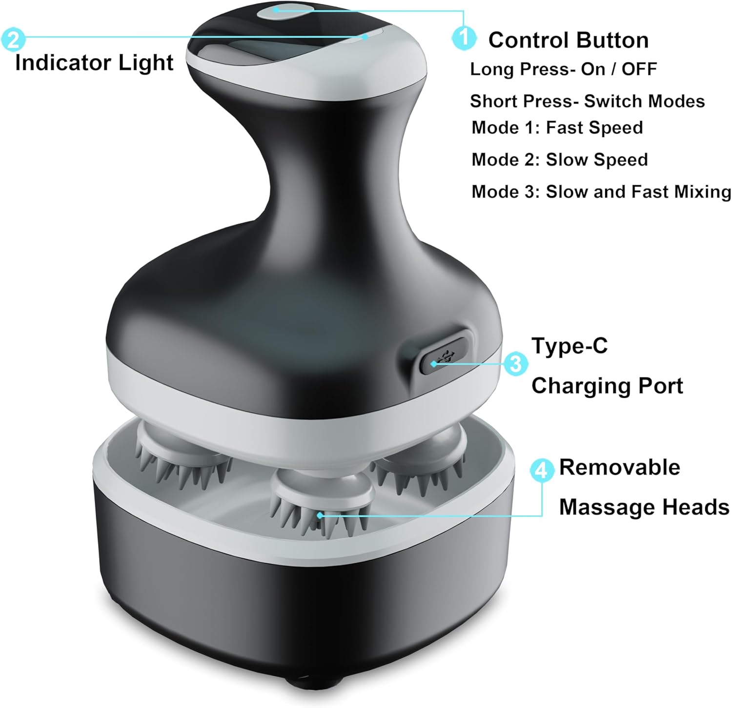 - 【2 Hardness Claws & 4 Working Modes】: Built-in 1200 mAh battery, long battery life, yet only takes 1 hour to be fully charged. This scalp massager has 4 working modes, clockwise rotation low speed and high speed, counterclockwise rotation low speed and high speed. We also have 4 hard massage claws and 4 soft massage claws give you different experience.