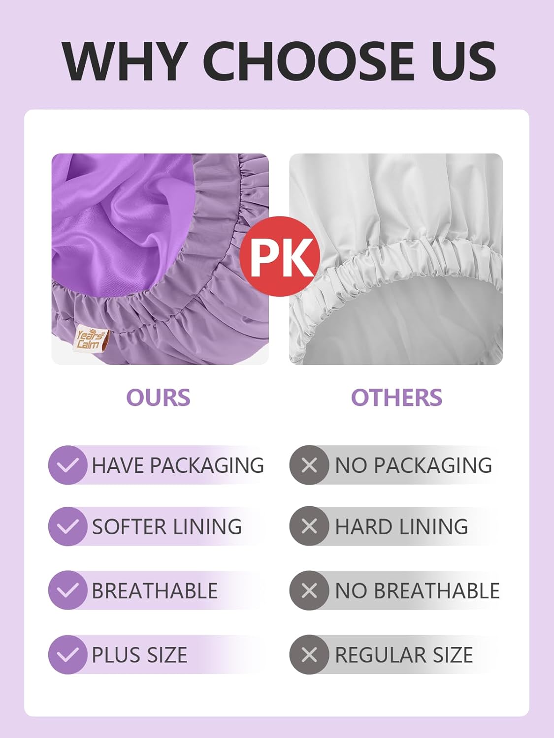 - Waterproof Hair Protection: Made with a dual-layer design, featuring waterproof memory cotton and a soft satin lining, our shower cap prevents water from soaking through and helps protect your hair from damage. Ideal for all hair types, including long hair