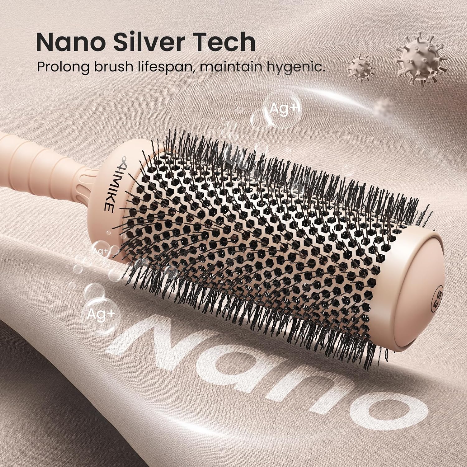 - Nano Silver Ion Infused Tech Round Hair Brush: AIMIKE nano round brush will emits negative ions while blow drying, which helps seal cuticles and eliminates unwanted flyaways and frizz for a sleek shiny hair. And its nano silver tech decides its hygienic feature and longer lifespan