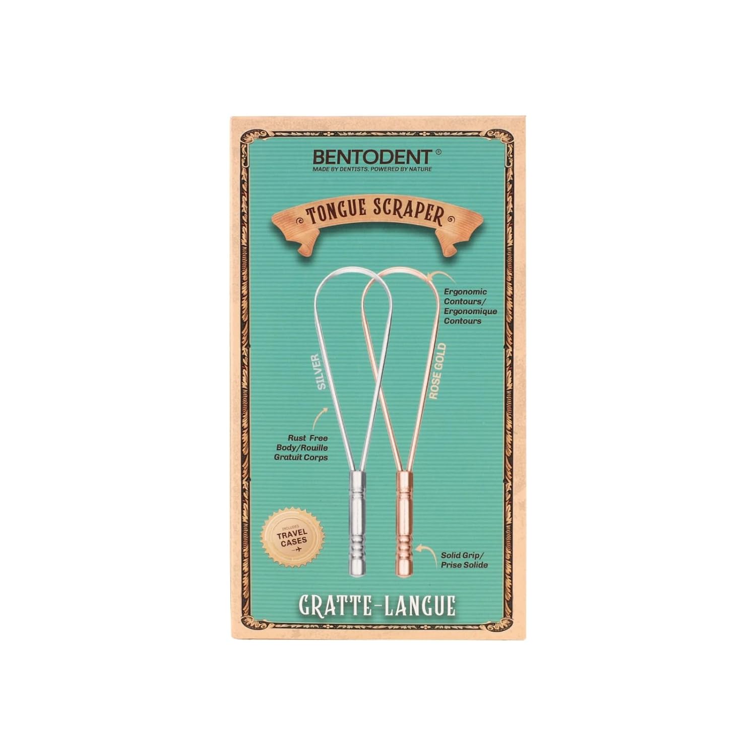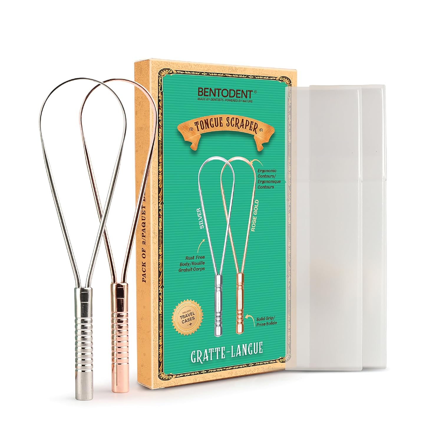 BENTODENT Tongue Scraper for Adults & Kids, Silver & Rose Gold, 100% Stainless Steel tongue scraper, Rust-Free metal, 2-Pack with Travel Case, Reduce Bad Breath, Tongue Scrubber, Tongue Cleaner