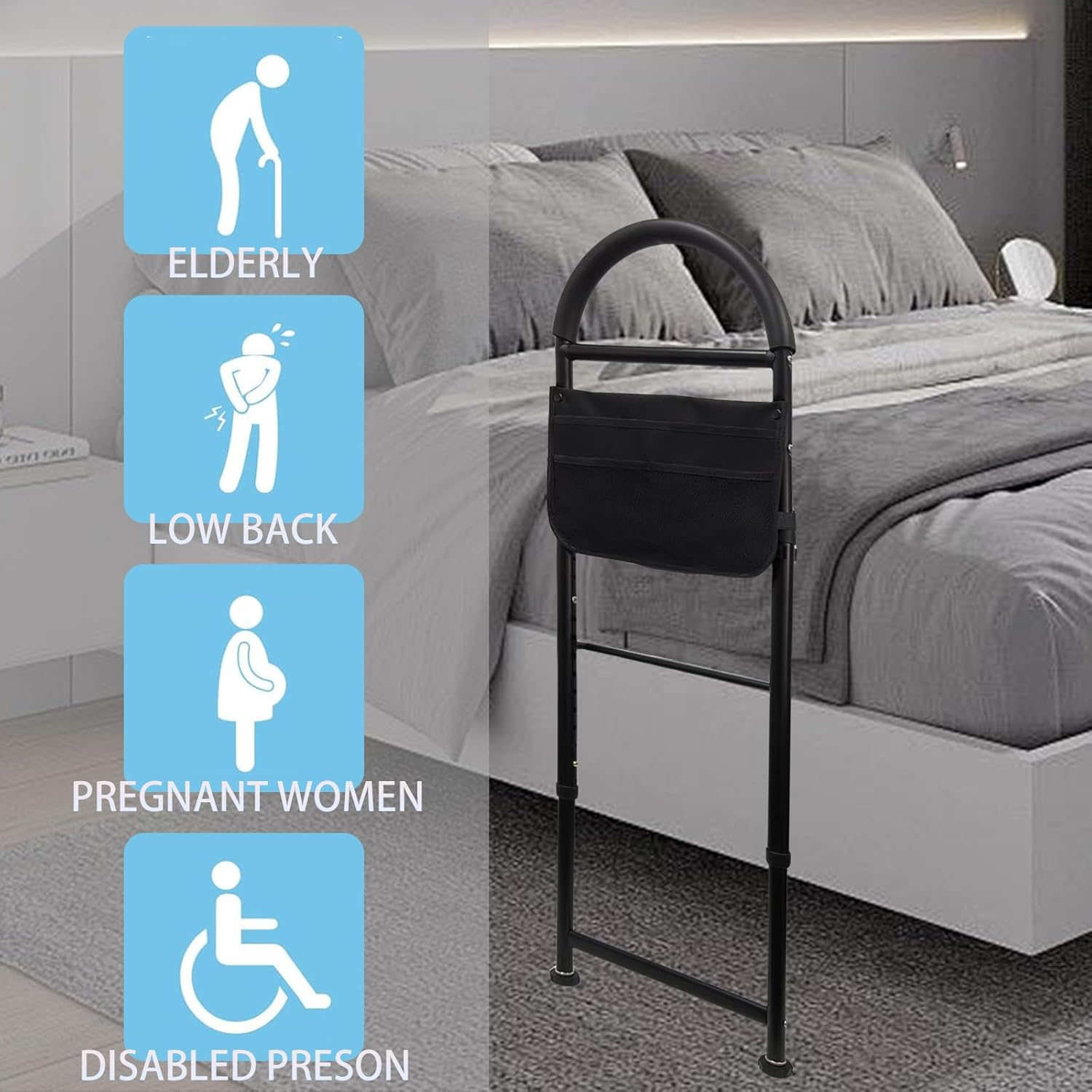 - Detachable Storage Mesh Bag: Bed grab rail includes a detachable storage bag. Allows you to store everyday personal items and accessories such as glasses, books, tissues and medical supplies without the hassle of getting out of bed