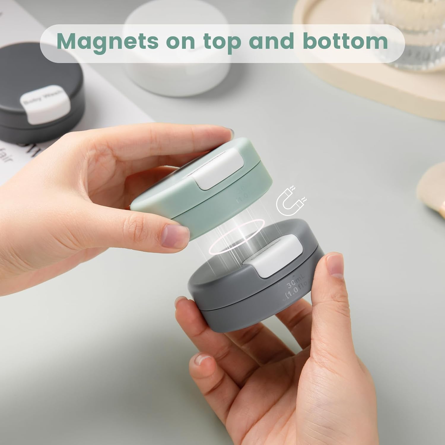 - Magnetic Design: 30ml travel containers feature a magnetic design that connects each container vertically. They include magnetic labels that seamlessly swap between all of Capsules.