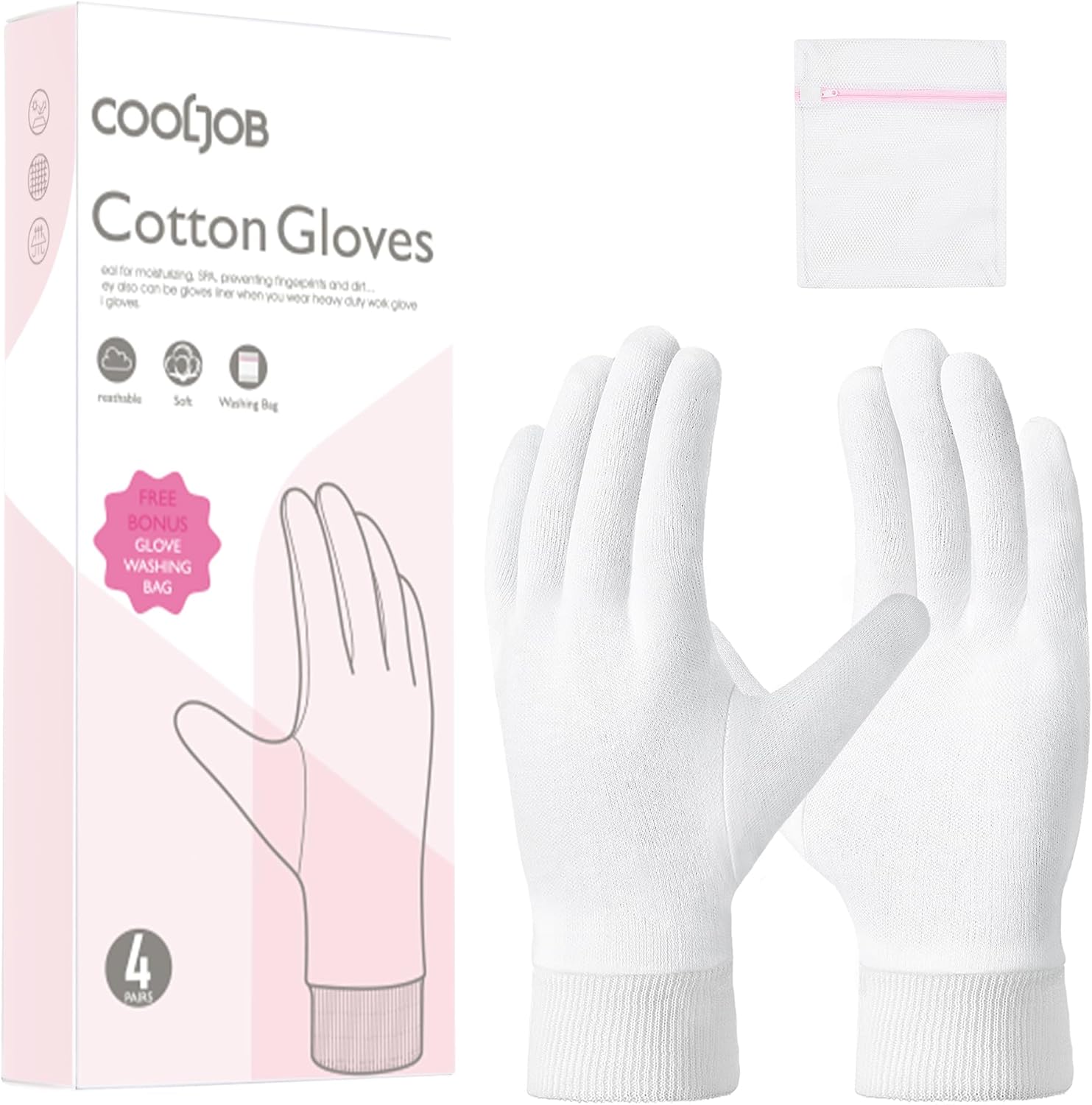 COOLJOB 4 Pairs Soft Moisturizing Cotton Gloves Set with Stretch Elastic Cuff, Overnight Lotion Sleeping Gloves for Dry Hands, Eczema Skin, Beauty Women SPA Essentials, XSmall, White