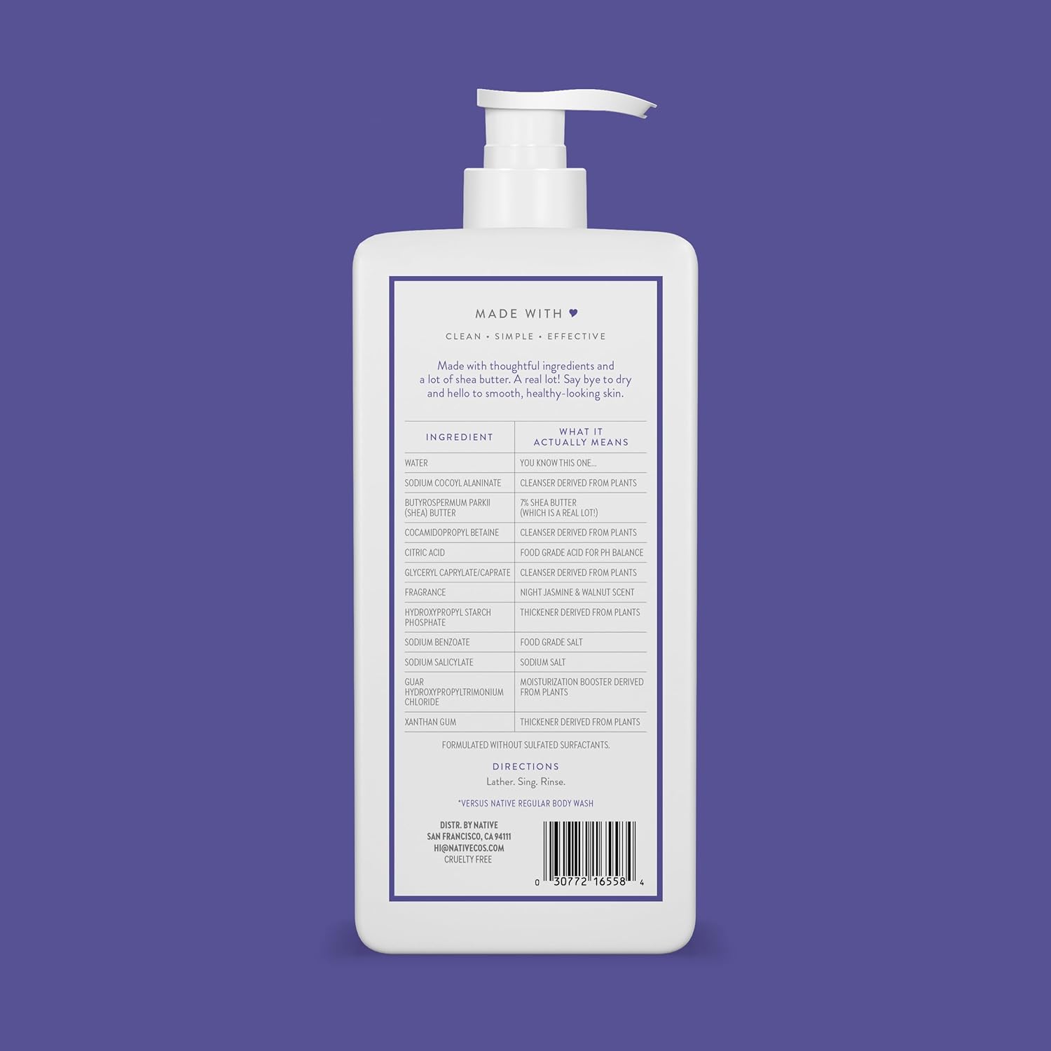 - NATURALLY DERIVED INGREDIENTS: Native Moisturizing Body Wash is thoughtfully crafted with clean, effective ingredients, free from sulfates, parabens, dyes, and petrolatum, ensuring a gentle cleanse for all skin types.
