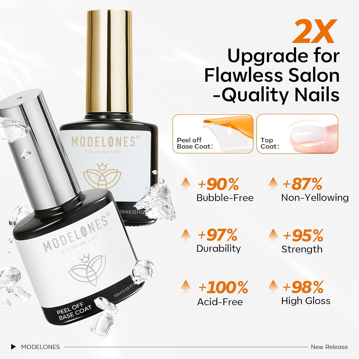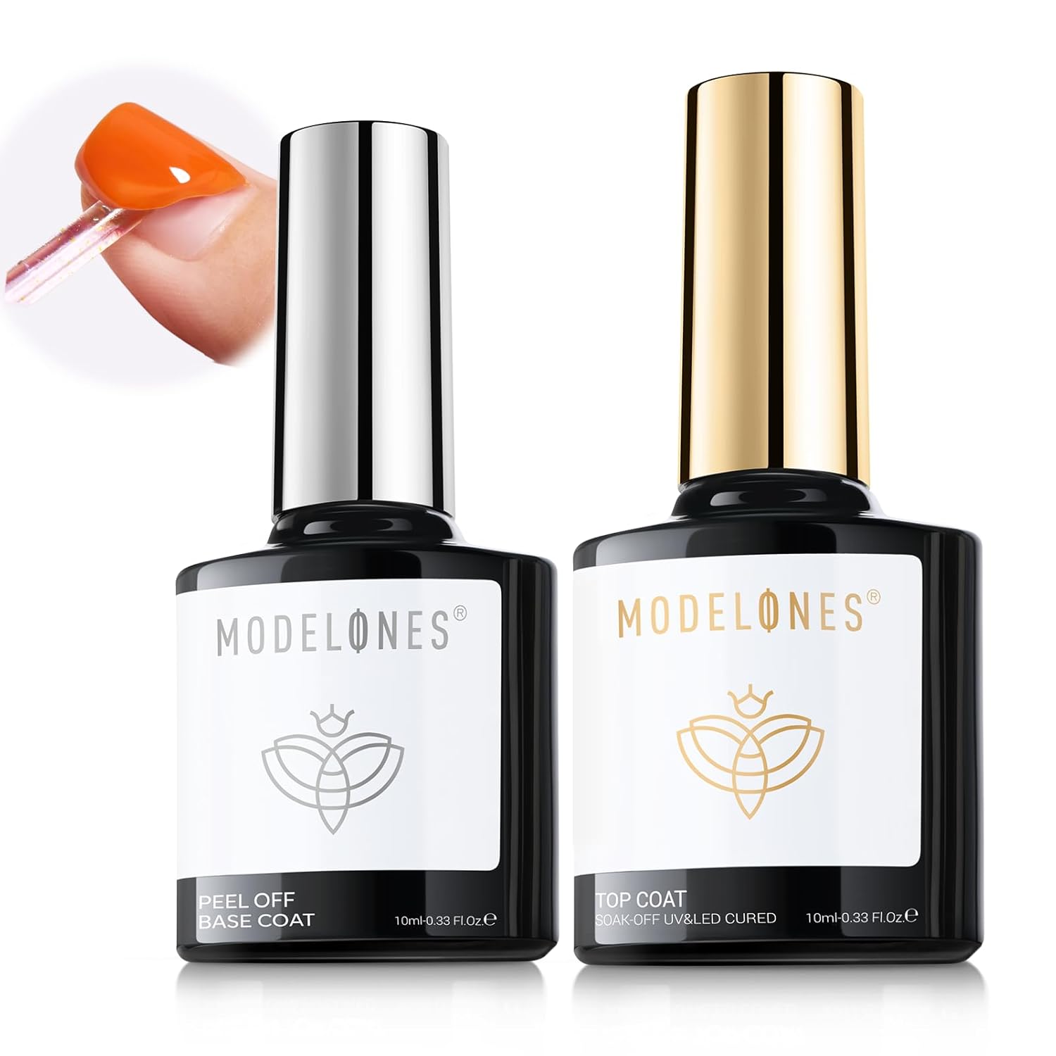 - Upgraded Formula Must-haves Set for Nail Art: modelones upgraded manicure essential kit includes 1*10 ml peel-off base coat+ 1*10 ml gel top coat. Delivers a high-gloss, bubble-free finish with lasting durability. Acid-free and non-yellowing to protect and strengthen nails. Ensures chip-resistant wear with brilliant shine day after day
