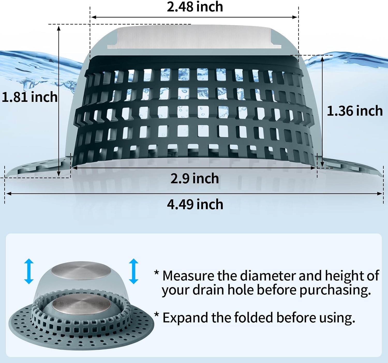 - Shower Drain Hair Catcher - Tall & dome design fits both flat and pop-up drains. Its outer diameter measures 4.49", inner diameter 2.9", inner height measures 1.36", fits most US standard drains.