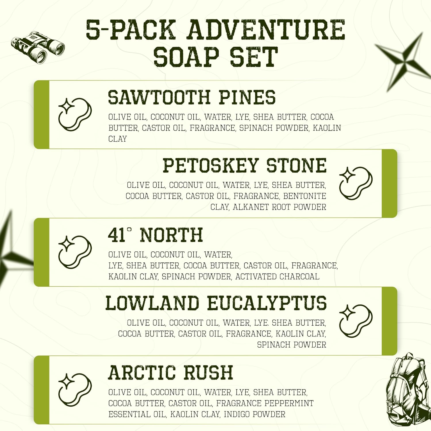 - SCENT VARIETY: Elevate your grooming with a mix of bold scents in our variety pack, featuring Sawtooth Pines, Petoskey Stone, 41° North, Lowland Eucalyptus & Arctic Rush. This mens body soap bar set is a perfect addition to your daily routine.