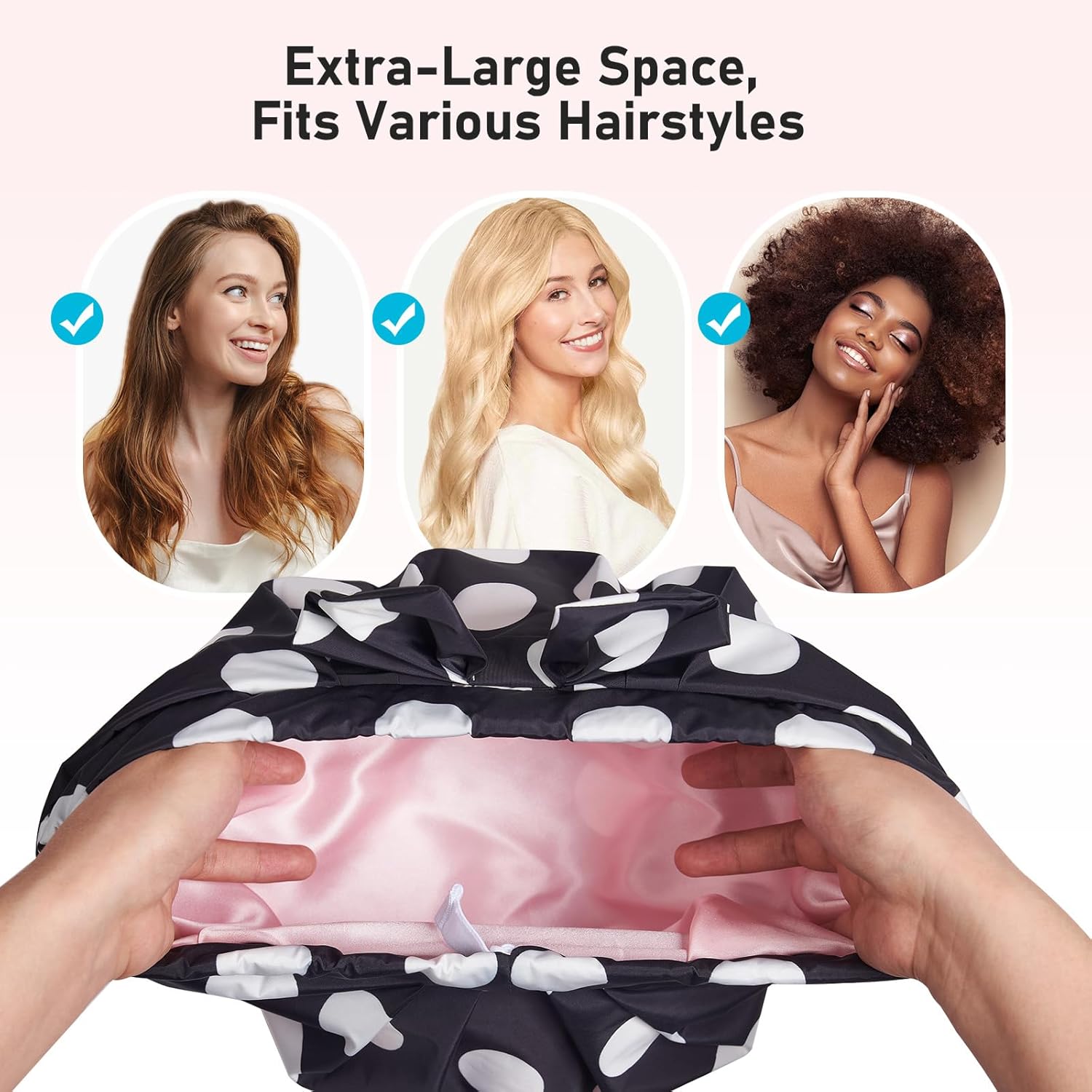 LitBear Luxury Silk Lined Shower Caps for Women Reusable Waterproof, Double Layered Large Bathing Hair Cap with Adjustable Elastic Strap, Non-slip, Quick-dry, for Long Short Hair, Black Dots