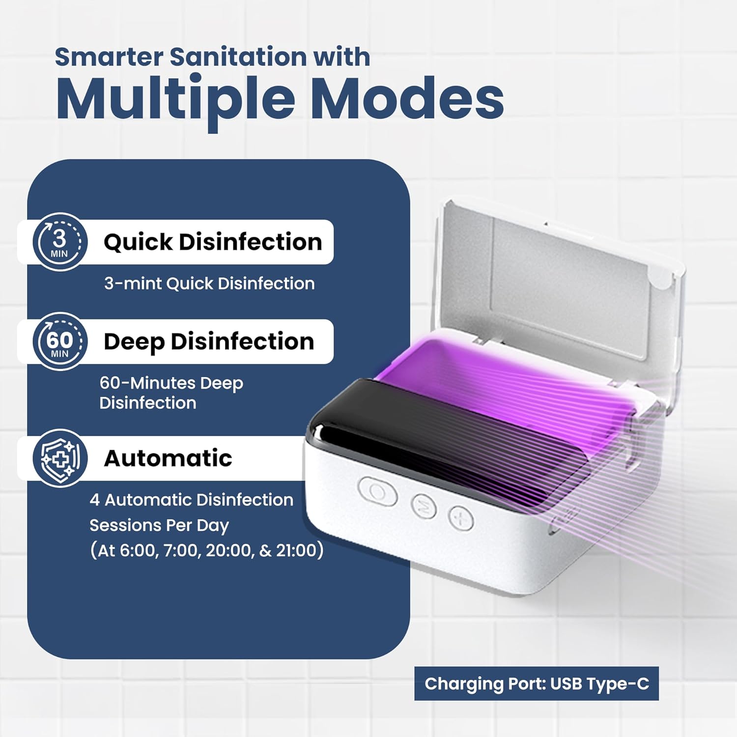 - Precision UV-C Care with Advanced Heating + Fan drying : Eliminate 99.9% impurities with powerful dual-band UV-C light and warm airflow. This UV tooth brush sanitizer holder keeps your brush cleaner and drier making it safe for daily use by the whole family.