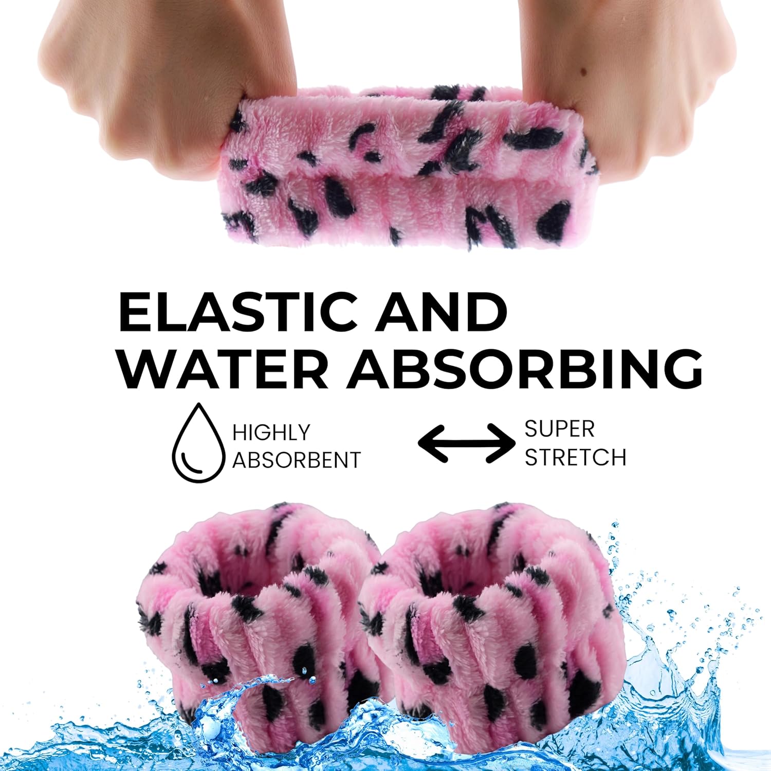 Spa Headband Wrist Band for washing face set Sponge Makeup Skincare Headband Wrist Towels Bubble Soft Terry Towel Cloth Hairband for Women Puffy Headwear Non Slip Thick Thin Hair Headwear (Leopard)