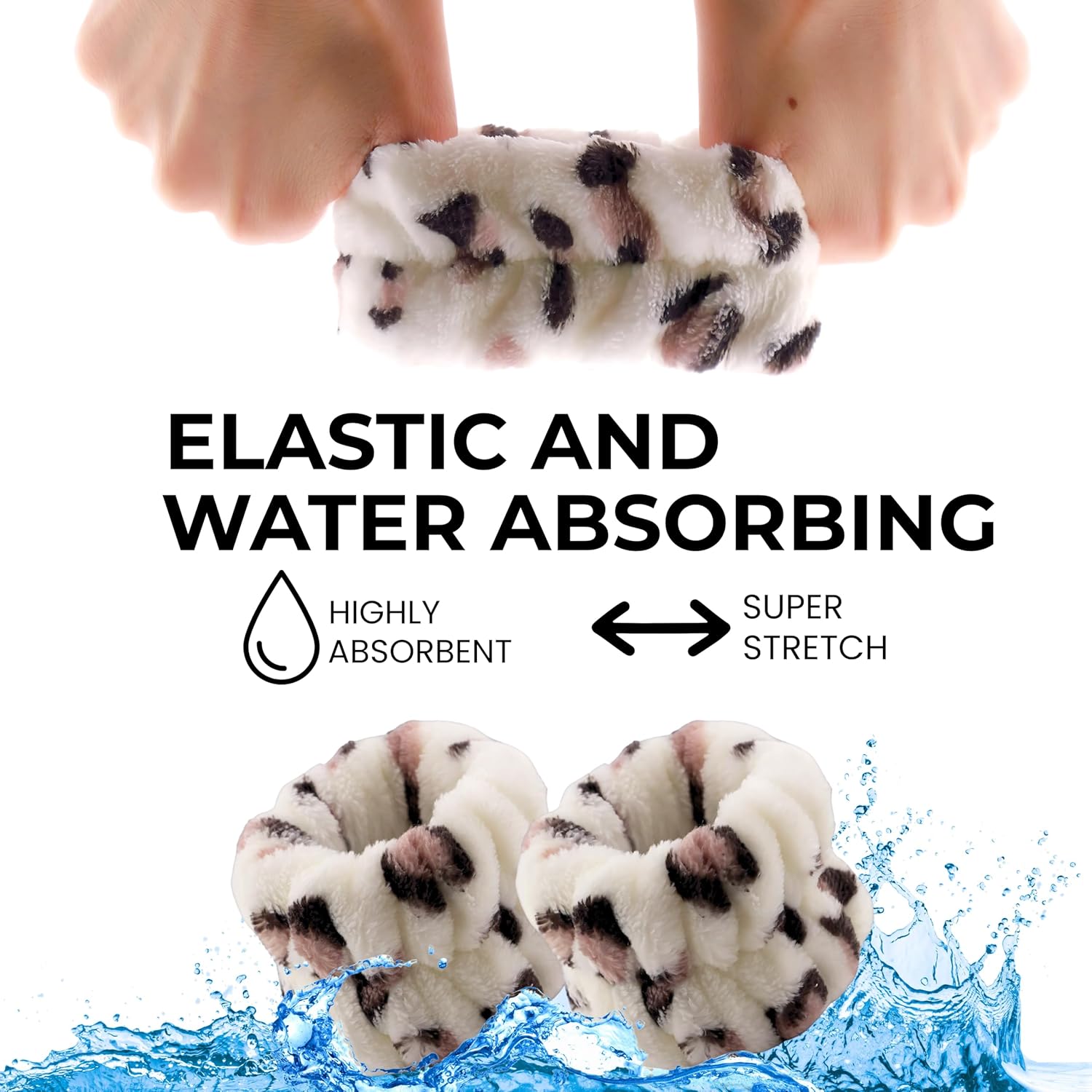 Spa Headband Wrist Band for washing face set Sponge Makeup Skincare Headband Wrist Towels Bubble Soft Terry Towel Cloth Hairband for Women Puffy Headwear Non Slip Thick Thin Hair Headwear (Leopard)
