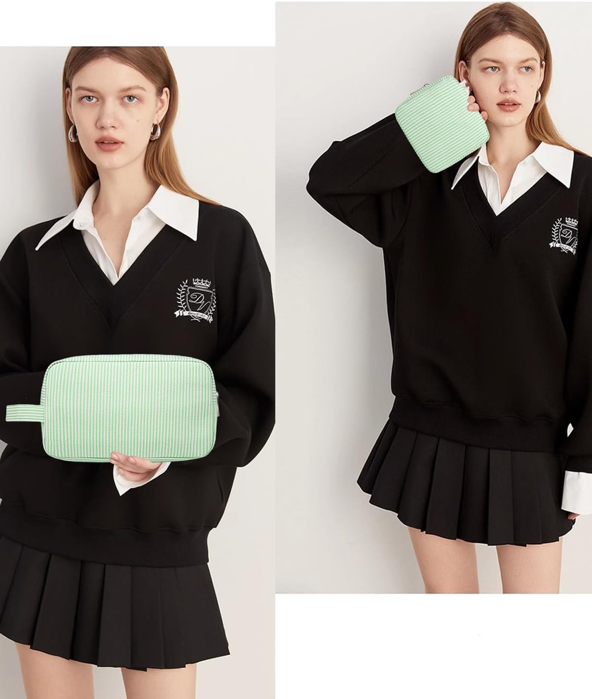 • Multi-functional Use: Toiletry bag with compartments is easy to store makeup brush, make-up, toiletries, eyebrows, eyeliner, cream, lipstick, perfume, jewelry, Air Pods, charging cords, medications, sanitary napkin and other things organized and protected. Can be used as a makeup bag, toiletry bag, or small storage bag ect