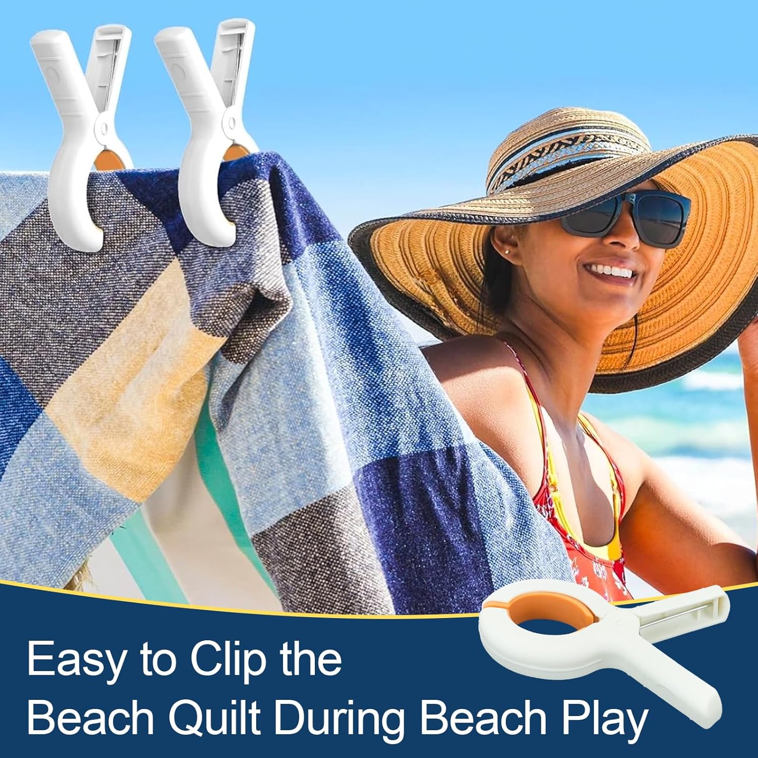 - 【Extra clamping force for stability】Our upgraded beach towel clips are essential beach gear. These clips have wide openings to securely hold thick blankets and beach towels, allowing you to fully relax and enjoy your beach time, preventing blankets from slipping off beach chairs onto the ground, providing you with a quality use experience!