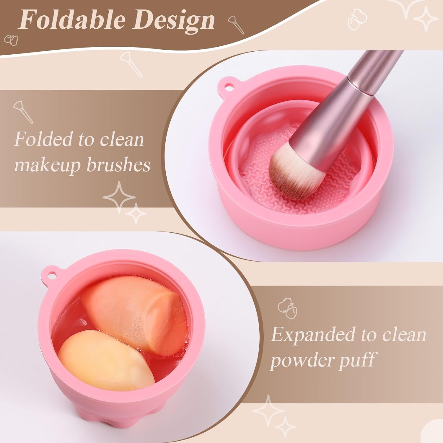 WantGor Makeup Brush Cleaner Mat with Brush Storage Holder, 3 in 1 Foldable Silicone Bowl Cosmetic Brushes Cleaning Pads Tool for Makeup Brush, Makeup Sponge, Powder Puff (Pink)