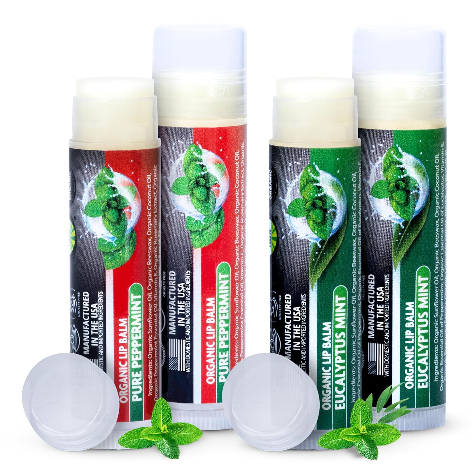 Organic Lip Balm Variety Pack | 4 Pack Peppermint & Eucalyptus Mint Chapstick Set | Moisturizing for Dry Lips | For Men and Women