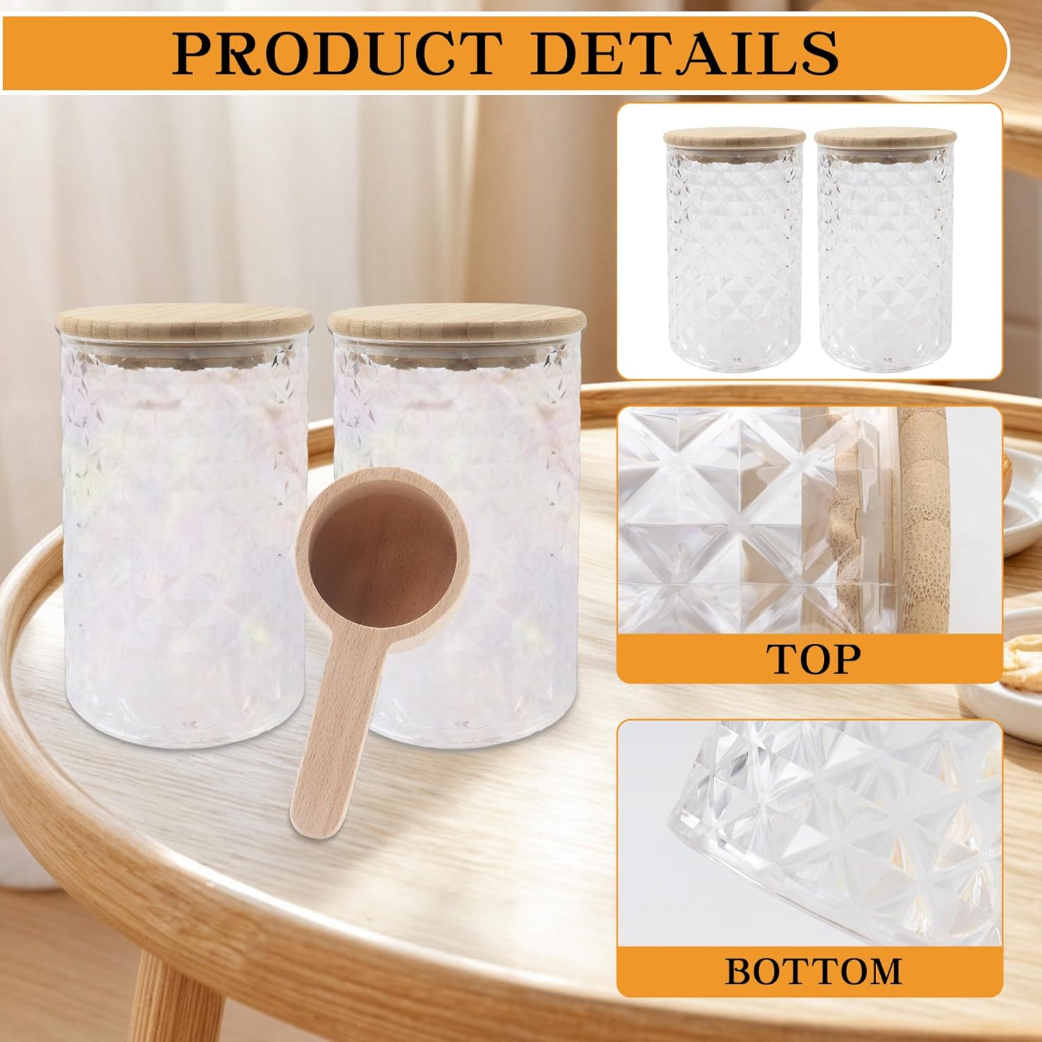 - Package Includes: The package you receive includes an bath salt jar with wooden spoon with lid. This jar is versatile enough to store cotton swabs, cotton balls, cosmetic pads