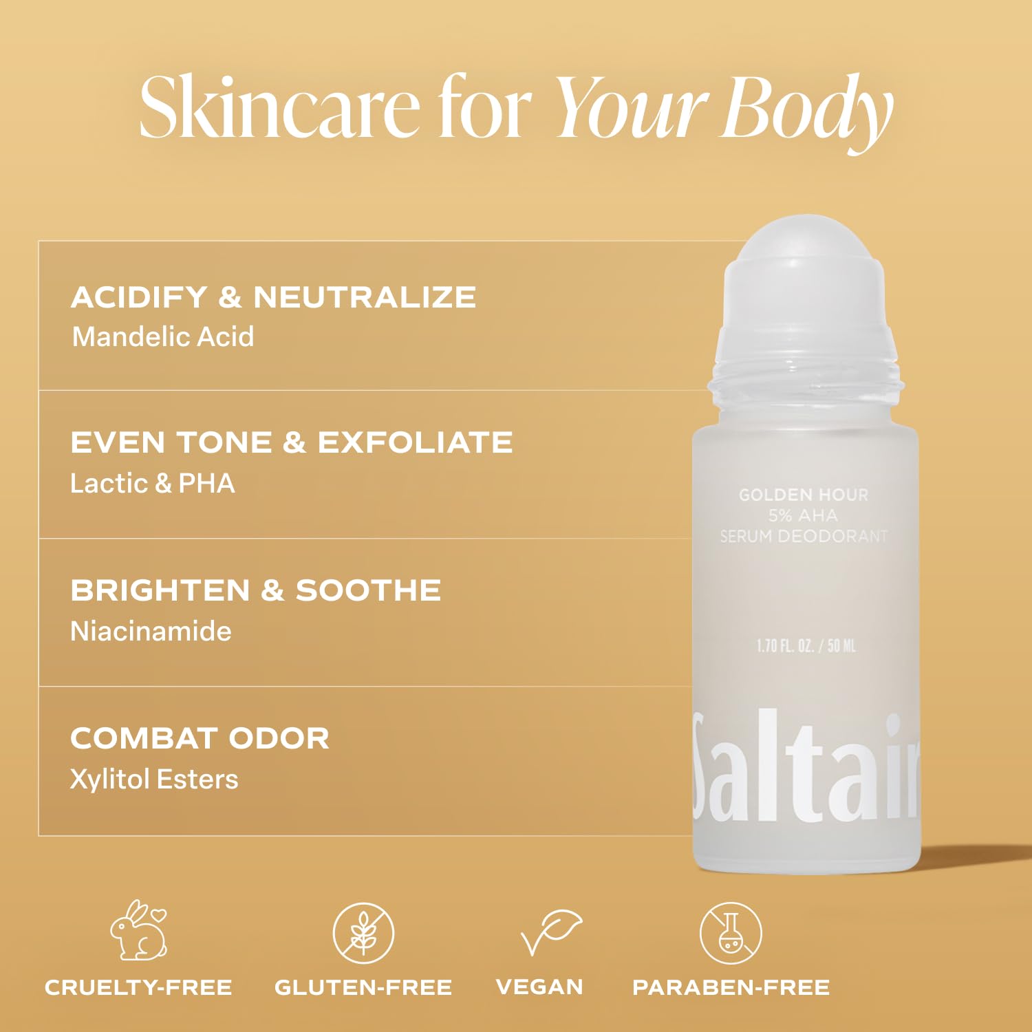 Saltair Serum Deodorant Golden Hour 2 Pack. 5% AHA Formula. Lactic Acid and Mandelic Acid Deodorant. Aluminum Free Odor Control for Women and Men. Travel Essentials, 2x 1.7oz Roll On