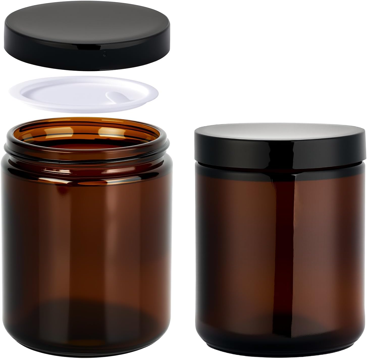 Hoa Kinh 8oz Amber Glass Jars with Lids - 2Pack Empty Airtight Storage Containers for Candle Making, Cosmetic, Spices, Crafts, Food - Refillable, UV Protection, Black Plastic Lid