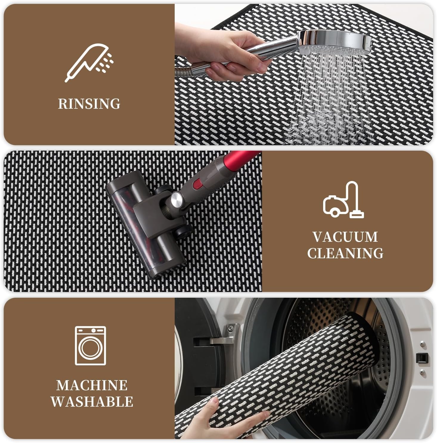 - Easy to Clean: Sturdy stitches and no-pile design make this bathmat suitable for machine washing and easy to maintain. After washing, just lay them flat to dry in the shade. Sweeping robots or vacuum cleaners can also be used for daily care to save time and effort.