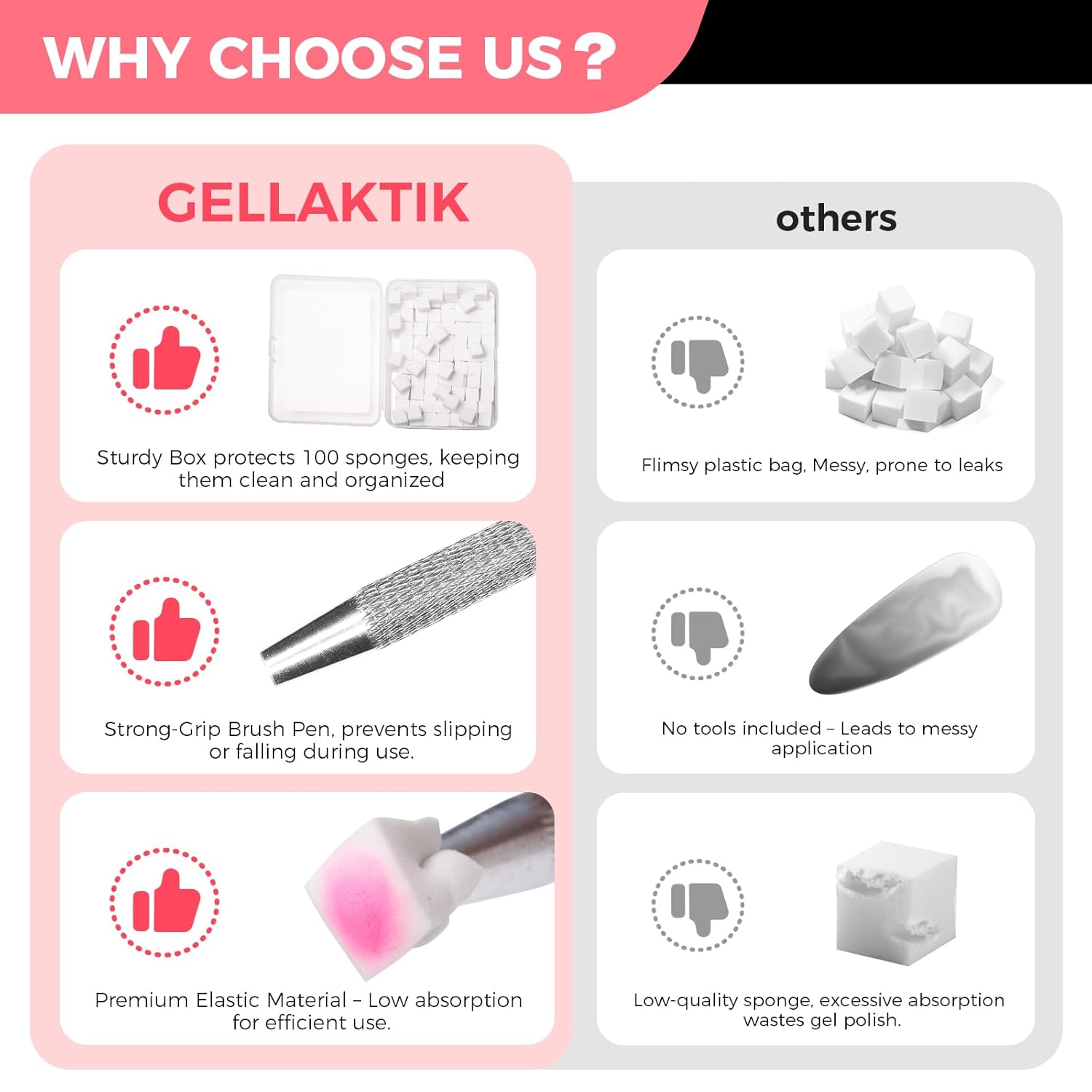 - 【Gellaktik Professional Nail Art Sponge Set】Includes 100 ultra-soft sponges (6 reusable sides) + 1 anti-slip metal pickup pen. Designed for nail art, gradients, and ombré effects, its low-absorption sponge tech minimizes gel waste, matching salon-quality tools. Perfect for beginners to achieve salon-worthy layered nail art effortlessly.