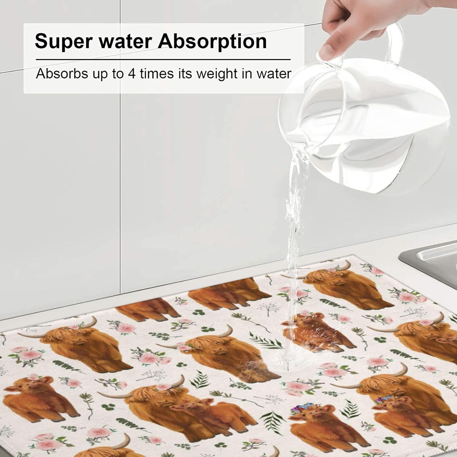 - 【Size & Quick Dry】18x24inch/45.7x60.9cm.Different design on 2 sides, one side can suck moisture with Highland Cow pattern, another one gray non-slip side.Our kitchen drying mat will suck up all the leftover wetness from your pots, pans, and dishes, and leave the underside both dry, easily keep your kitchen countertop dry and tidy.