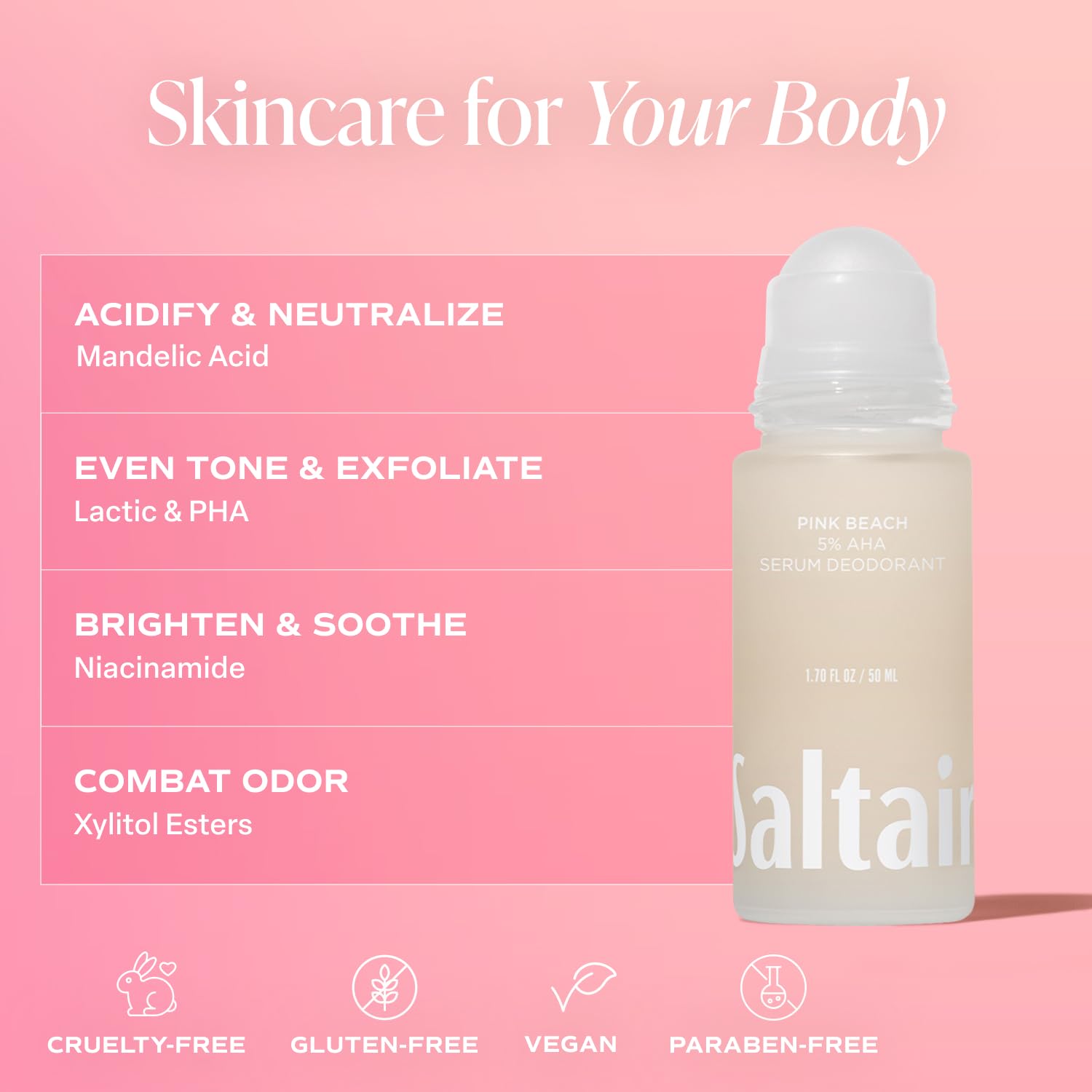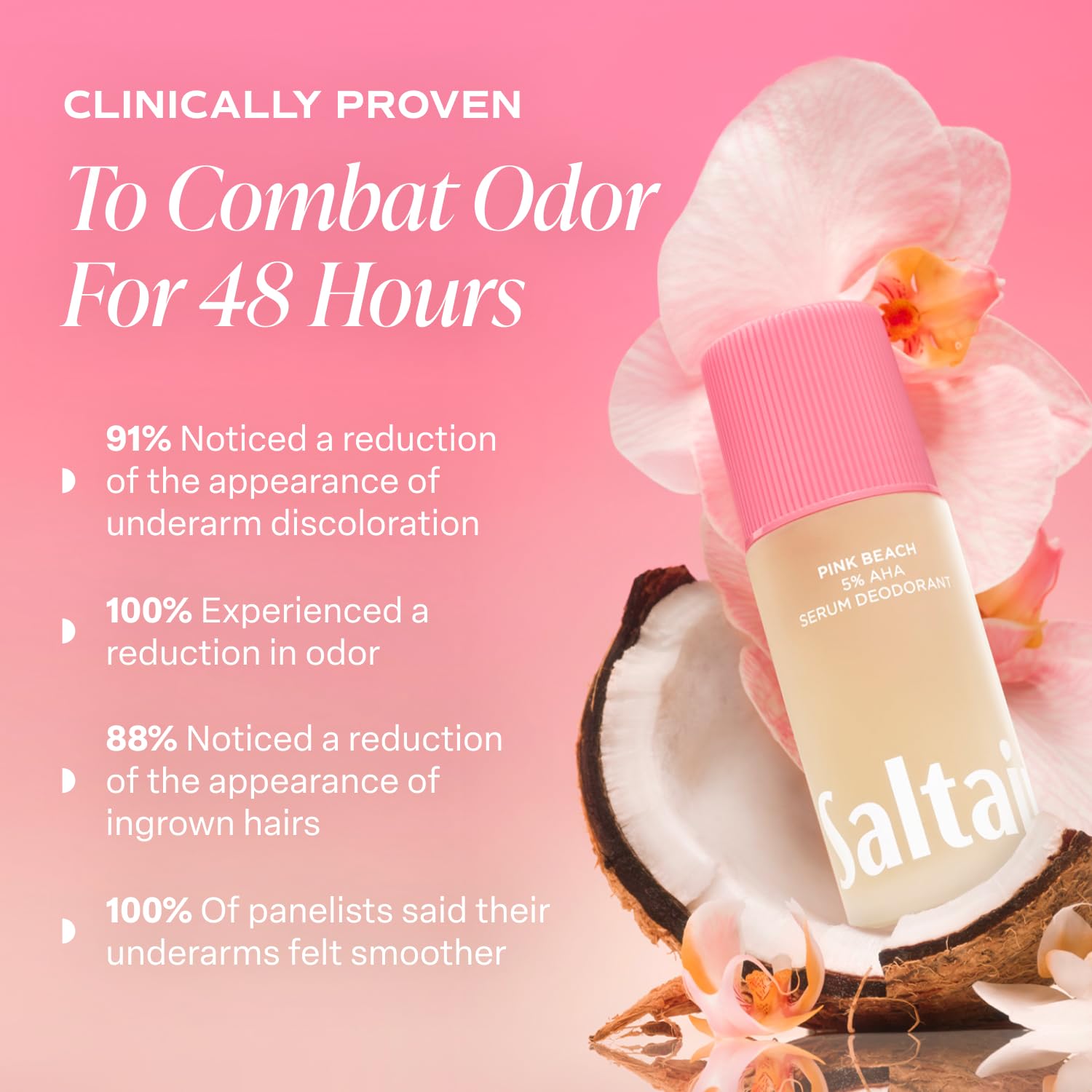 Saltair Serum Deodorant Pink Beach 2 Pack. 5% AHA Formula. Lactic Acid and Mandelic Acid Deodorant. Aluminum Free Odor Control for Women and Men. Travel Essentials, 2x 1.7oz Roll On