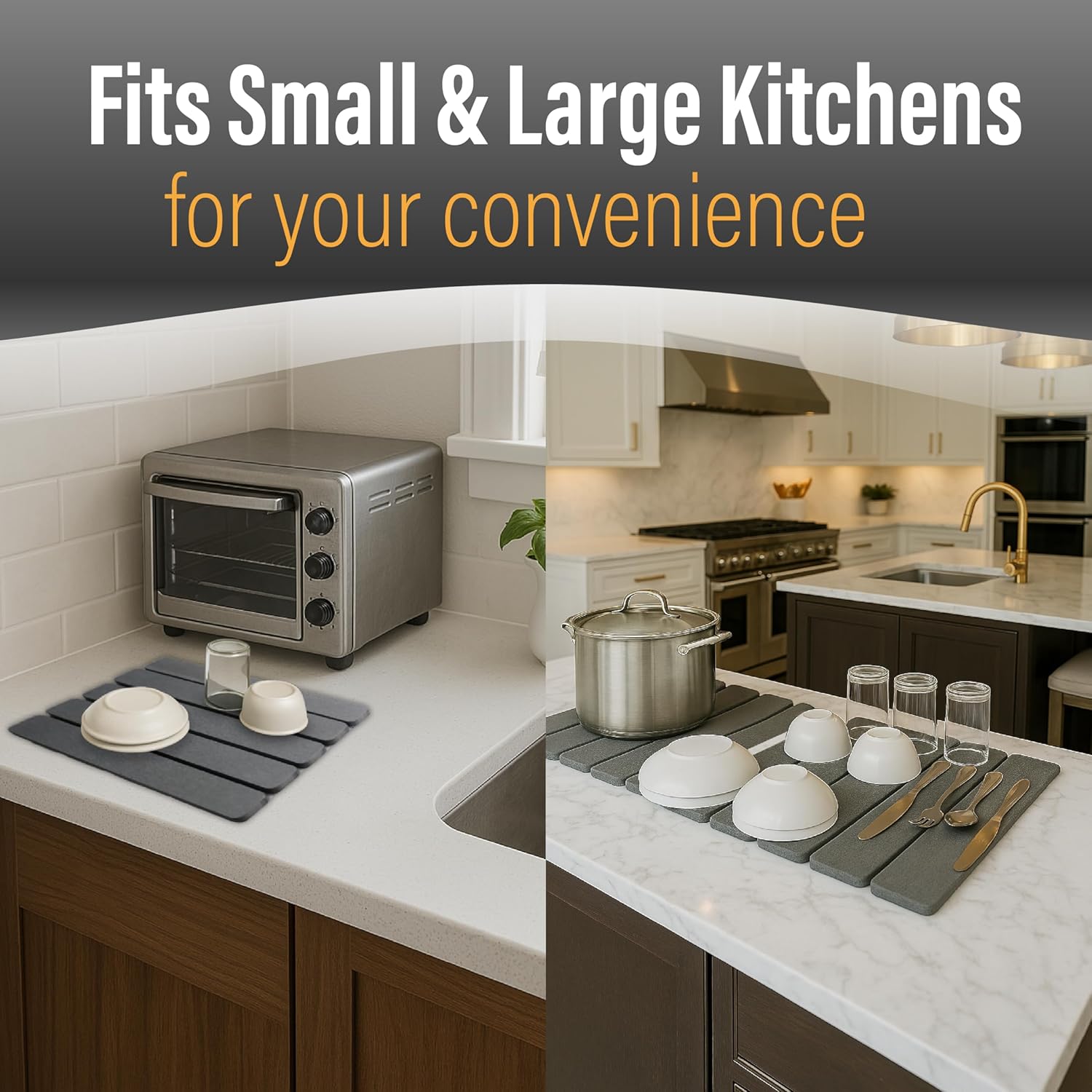 - Durable & Stable on All Counters: Built with five durable stone tiles bonded to a flexible backing, this drying mat for kitchen counter stays stable thanks to the included non-slip pad. It’s sturdy enough to hold dish racks, glassware, or pots. Fits beautifully on any surface—quartz, granite, wood—and adds a premium touch to your kitchen or bath.