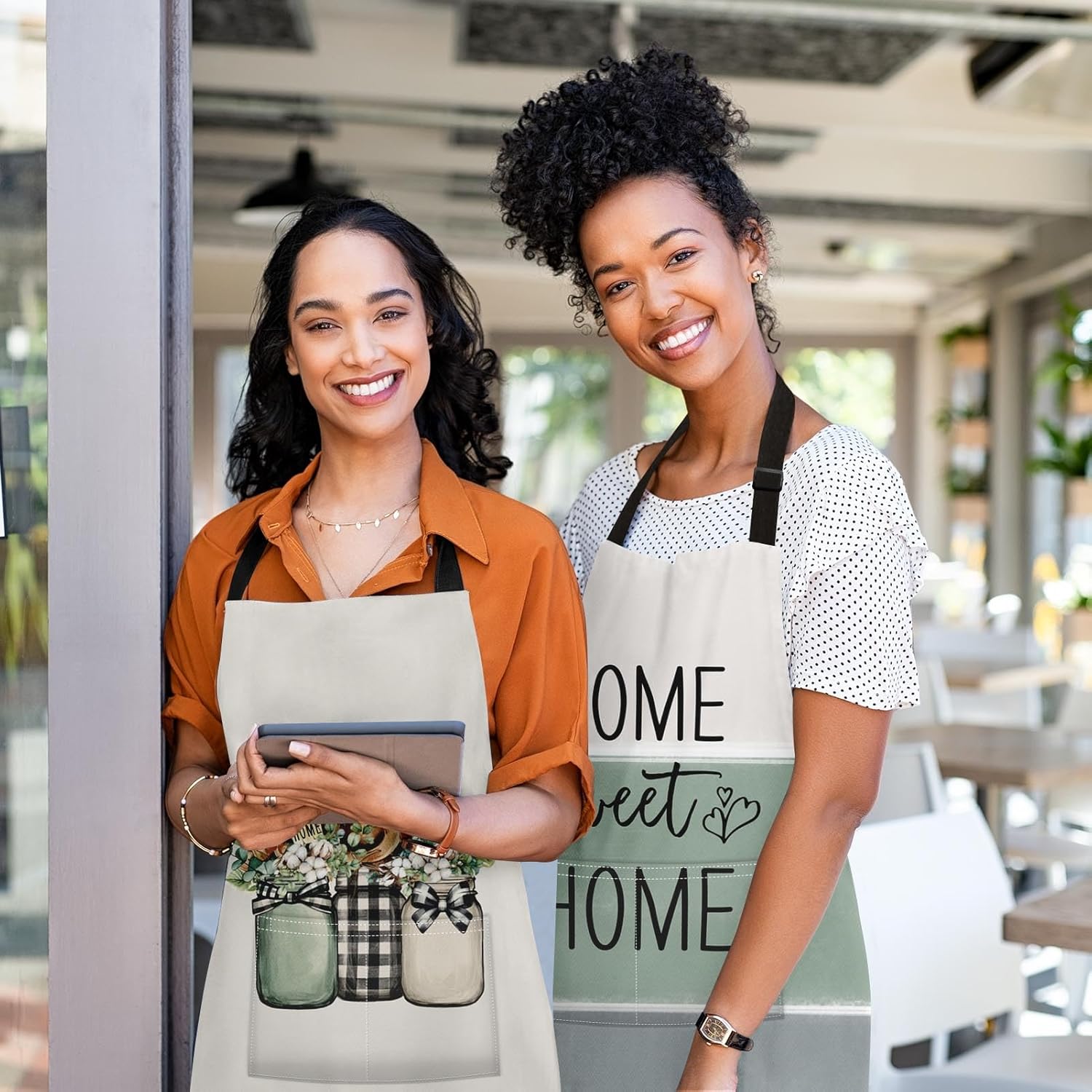 2 Pack Aprons, Eucalyptus Leaf Herbs Flowers Adjustable Bib Aprons with 2 Pockets for Women Men Couple Lovers Chef Home Kitchen Cooking Baking Gardening Cream Sage Green Stripe Apron 32x28 Inches