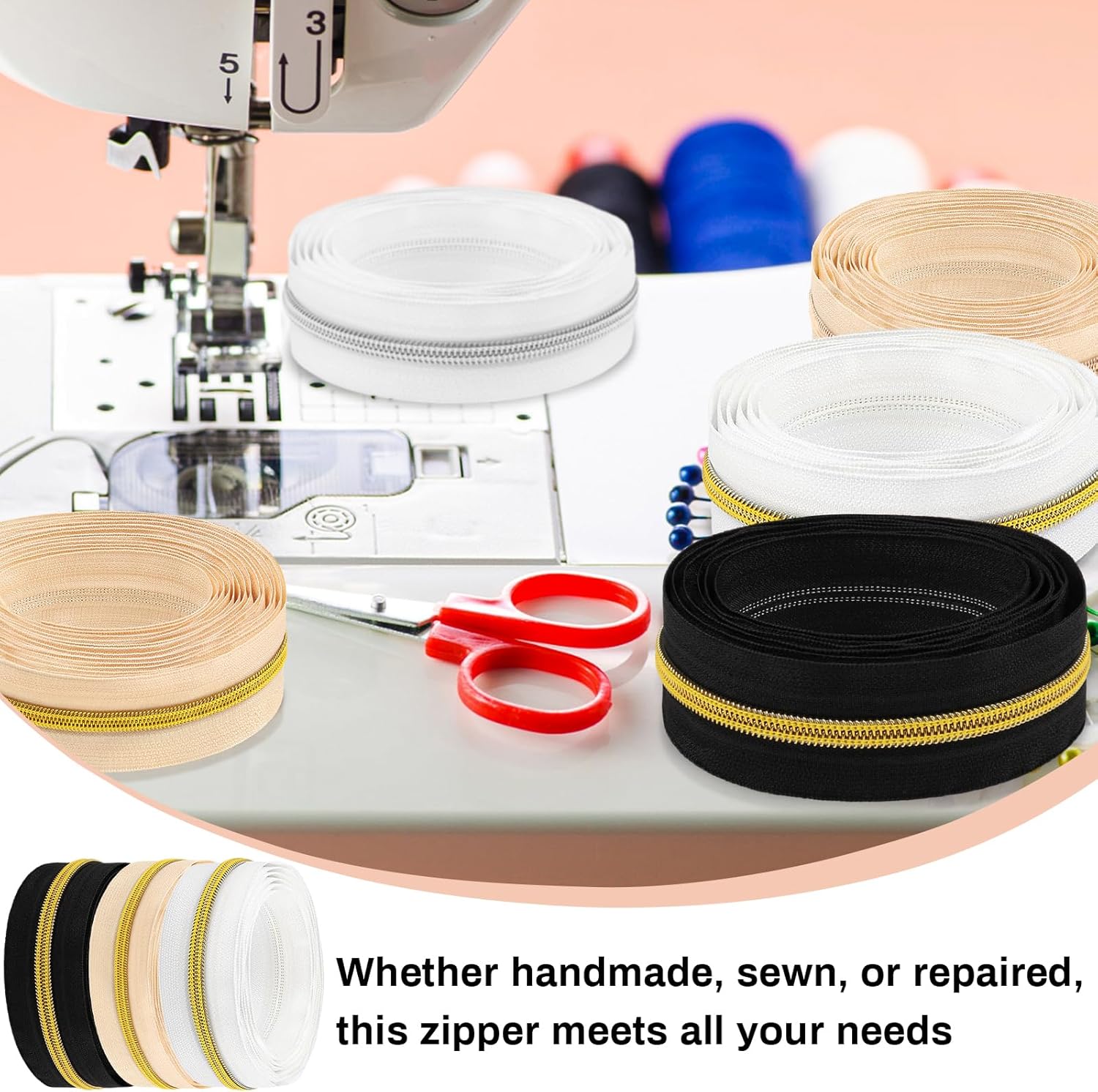DOITEM 17.8 Yards Endless Zippers by The Meter Black White Zipper 6 mm Spiral + 32 Nonlock Zippers (Gold Silver Rose Gold)